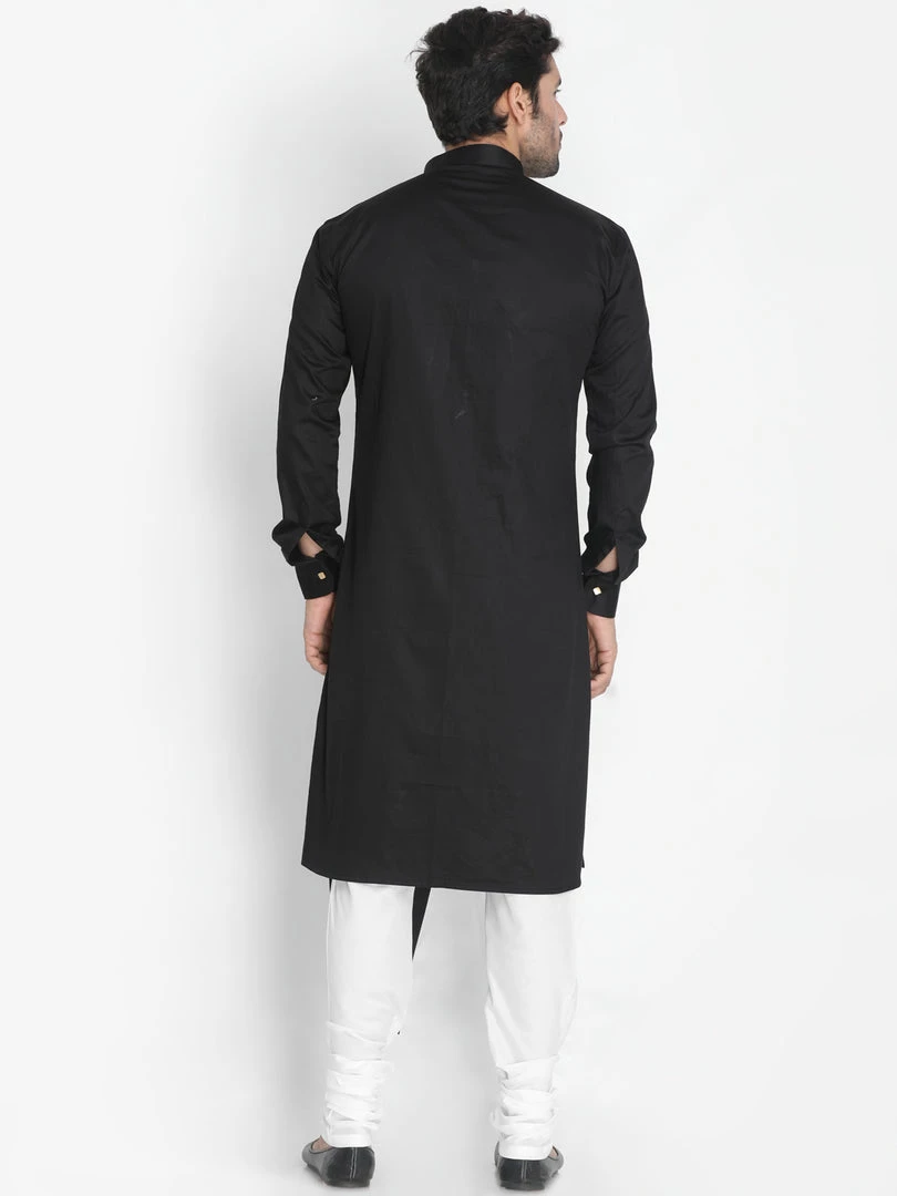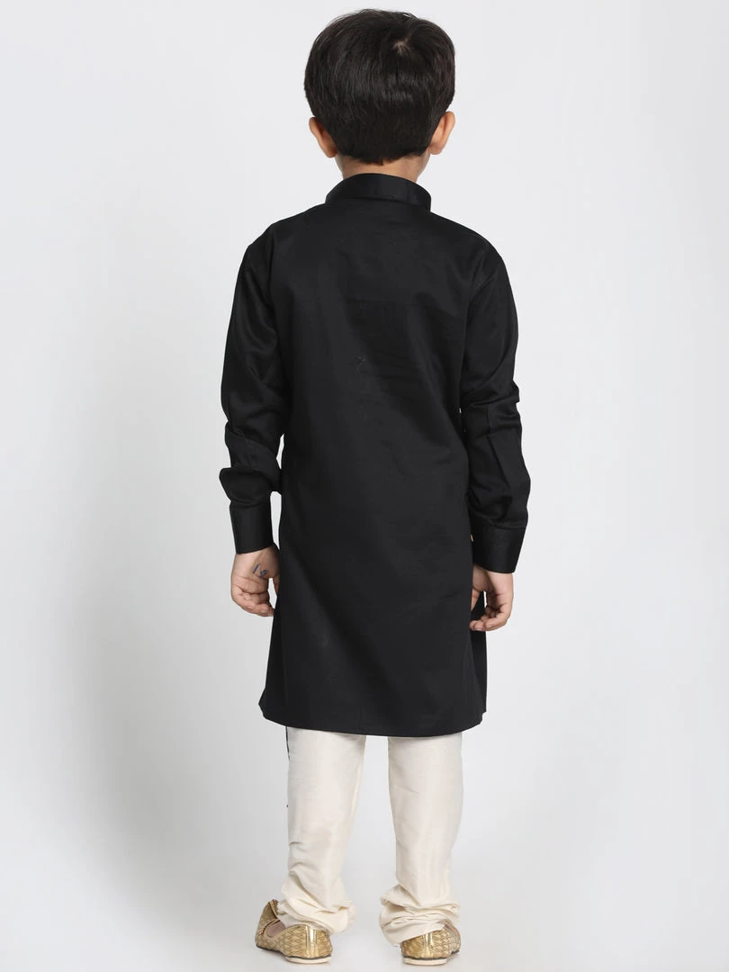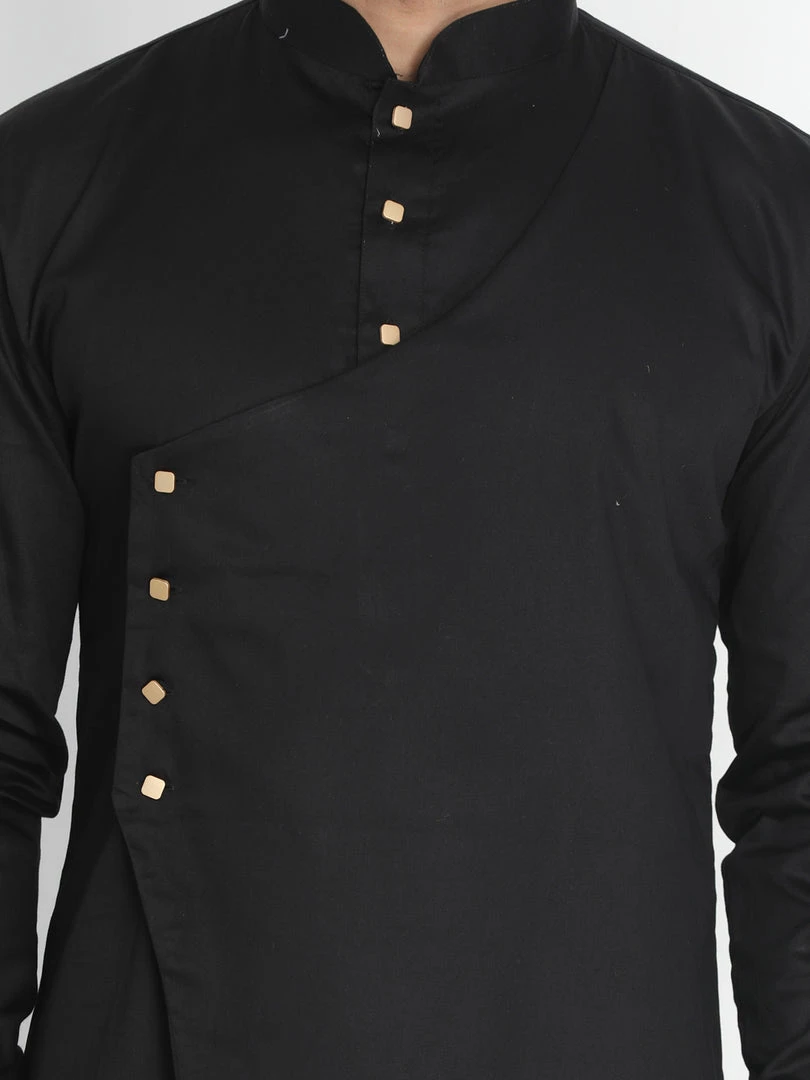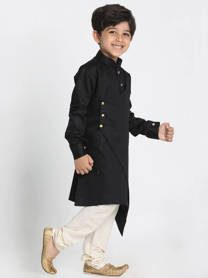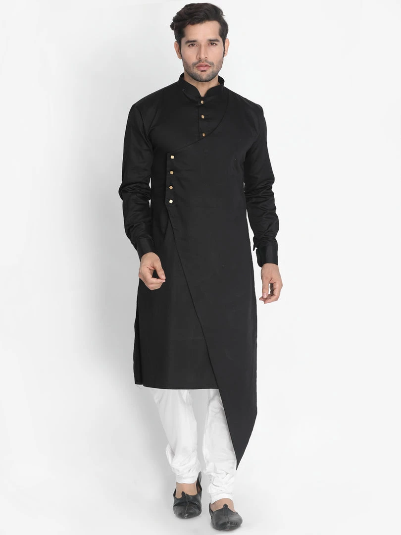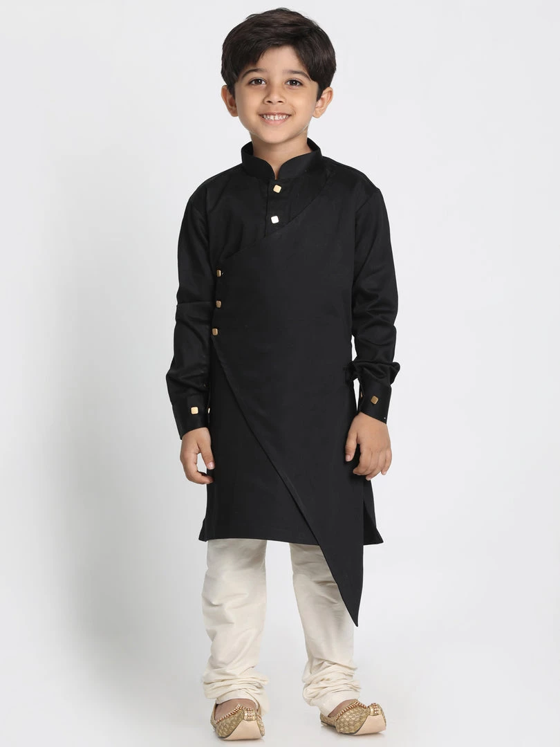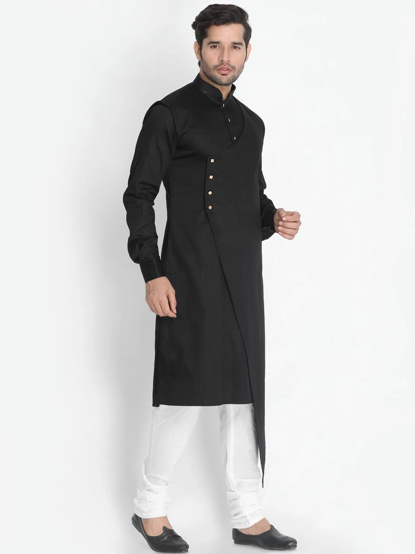 Black solid layered straight knee-length kurta, has a mandarin collar, button placket, long sleeves, asymmetric hem. Comes with a Cream color solid churidar, drawstring, and elasticated waistband