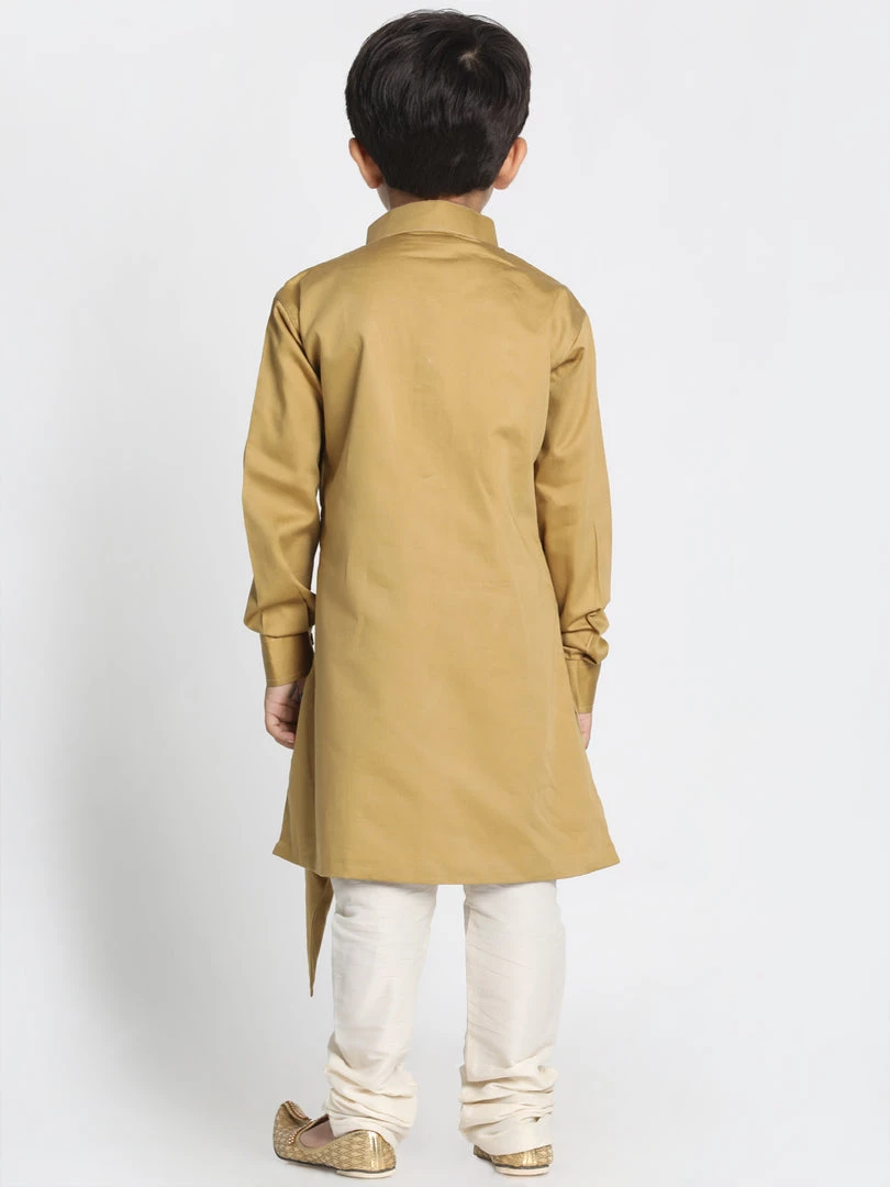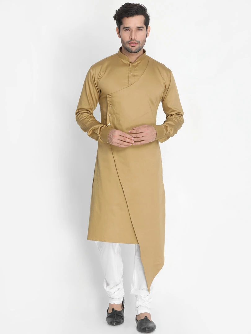 Chiku solid layered straight knee-length kurta, has a mandarin collar, button placket, long sleeves, asymmetric hem. Comes with a Cream color solid churidar, drawstring, and elasticated waistband