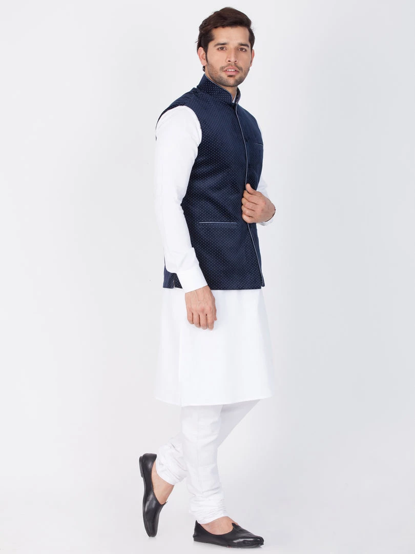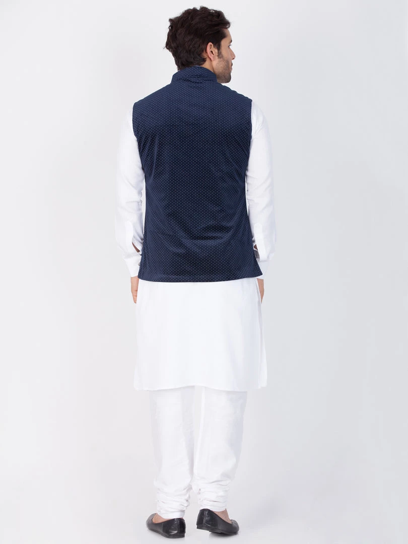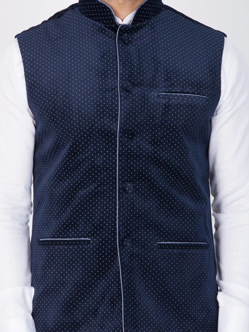 Blue polka dot printed Nehru jacket has a mandarin collar, sleeveless, full button placket, three welt pockets