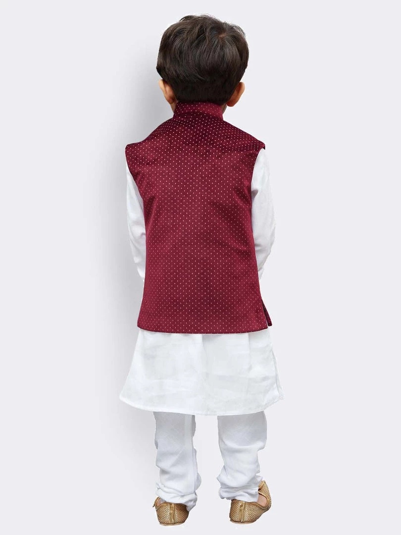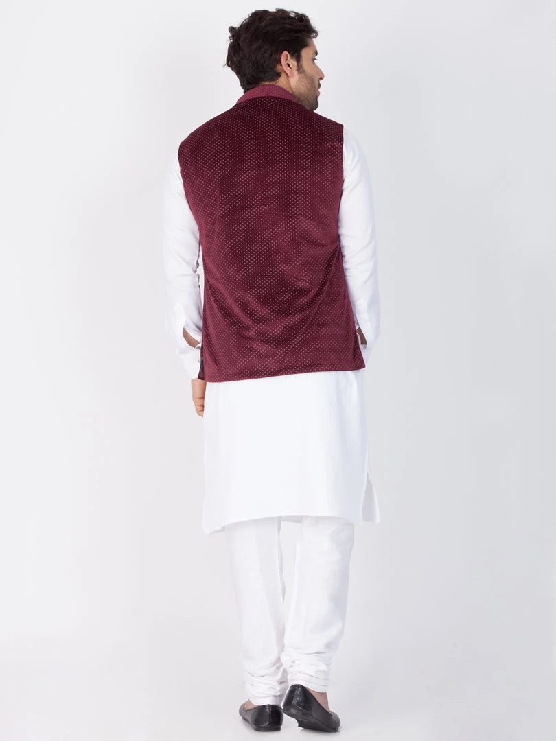 Maroon polka dot printed Nehru jacket has a mandarin collar, sleeveless, full button placket, three welt pockets
