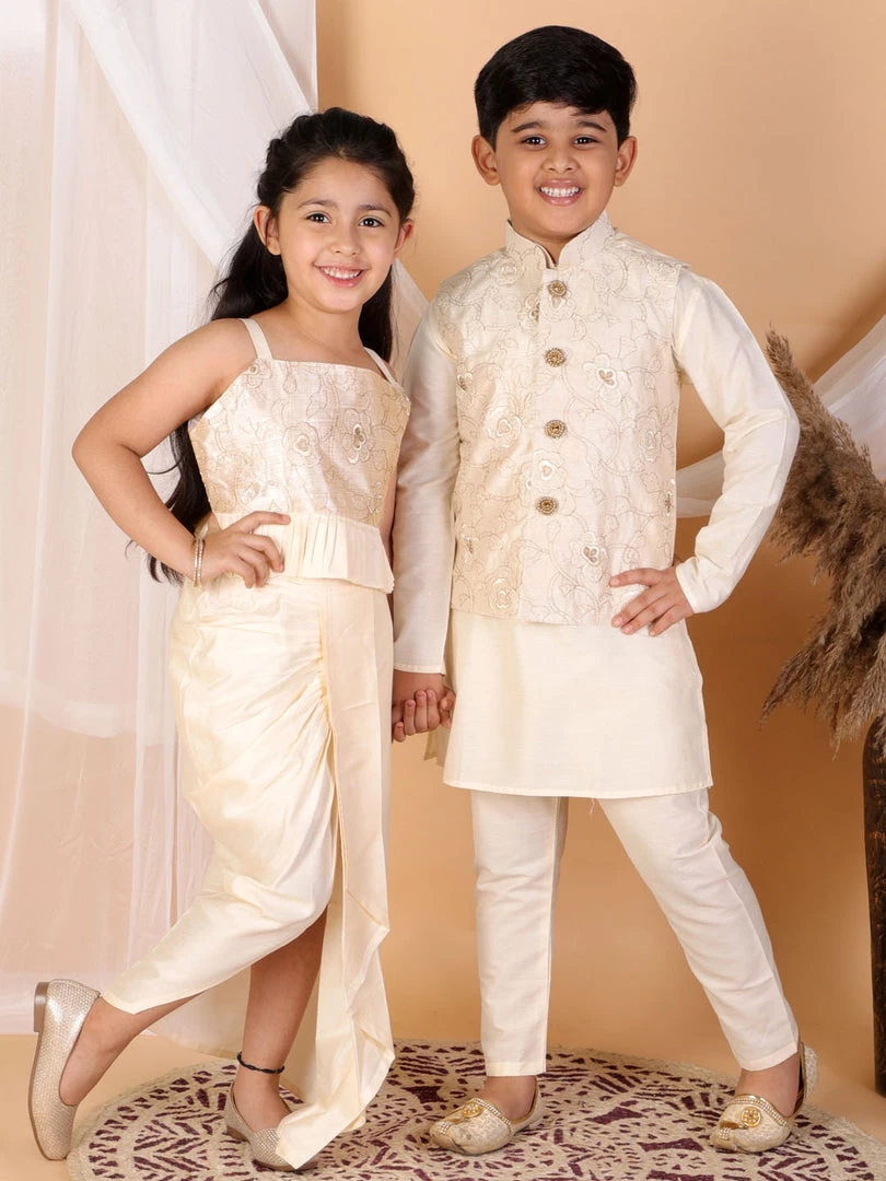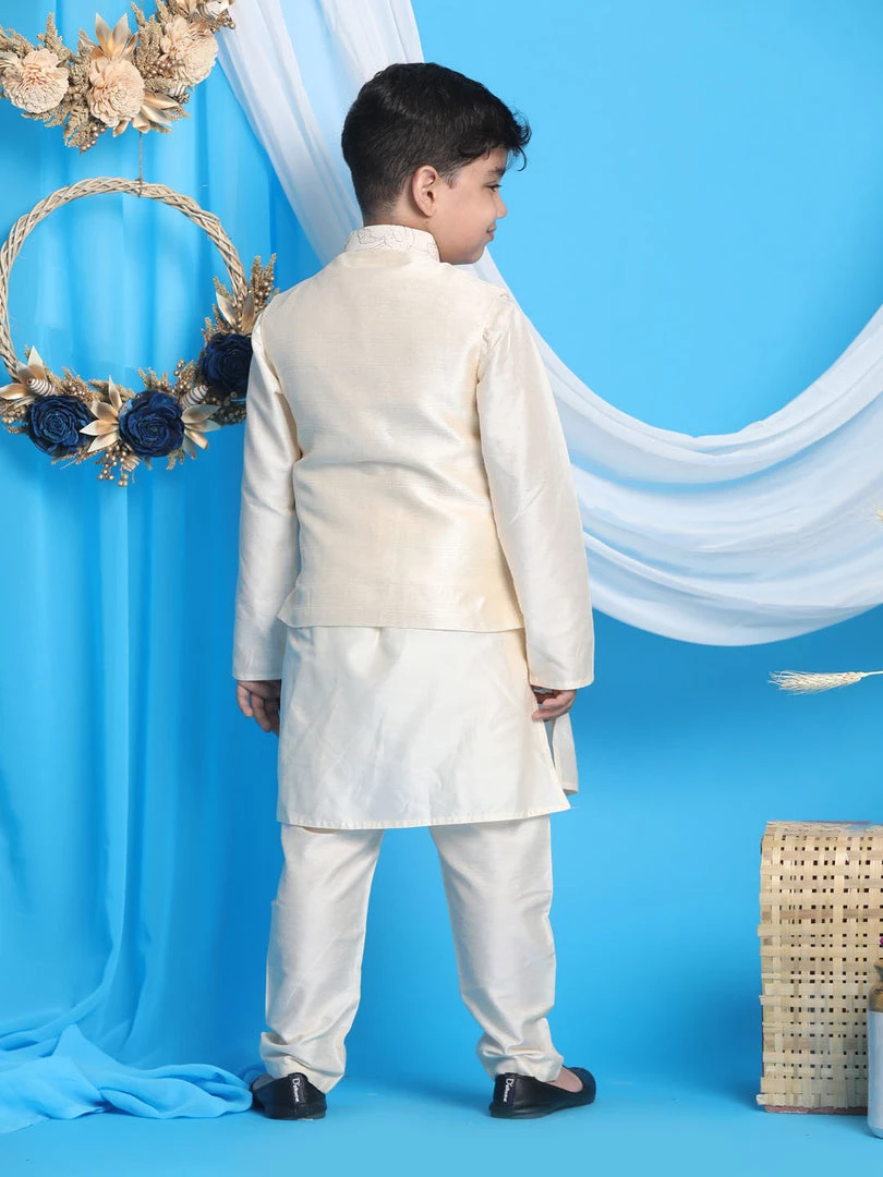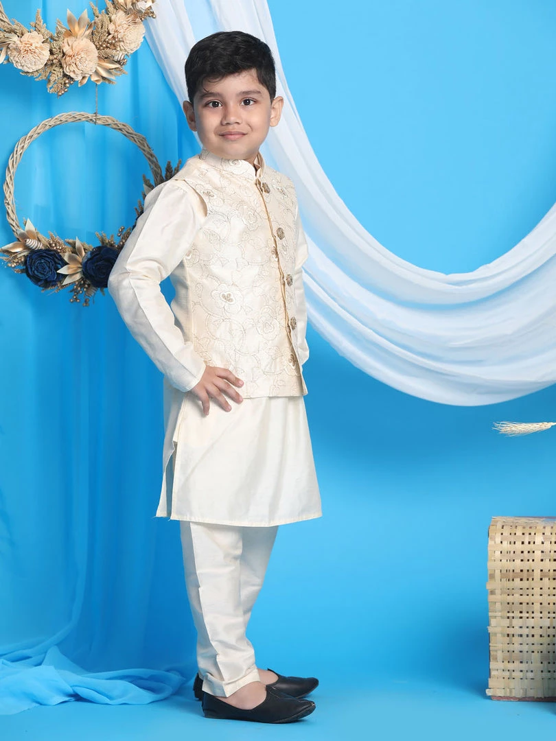 Beige color embroidered Nehru jacket, Regular style, has a mandarin collar, symmetric full button placket, sleeveless, one pocket with a pocket square, and symmetric hem.
