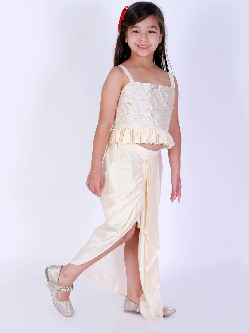 Gold color crop top has ruffle border, sleeveless with embroidered motif