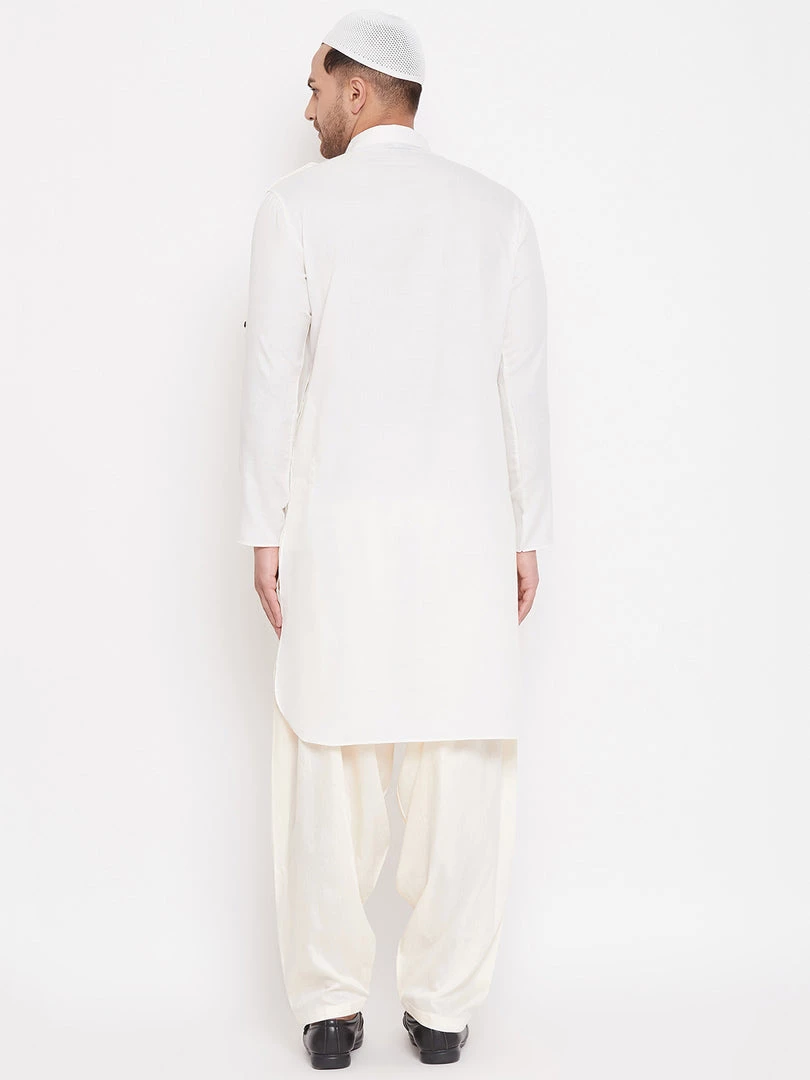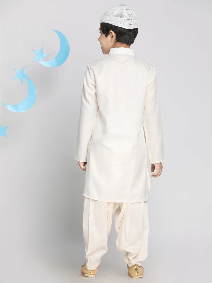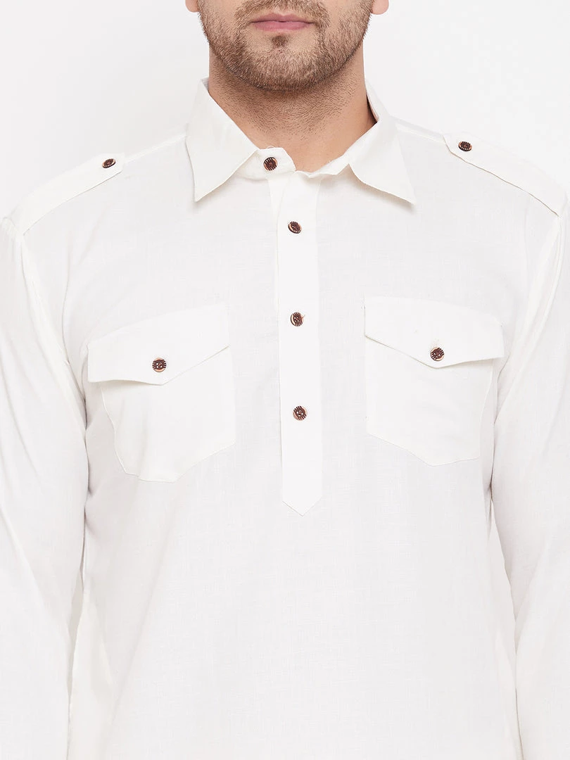 Cream color solid pathani kurta, has a shirt collar, long sleeves, shoulder tabs, button placket, curved hem, two patch pockets and side slits
