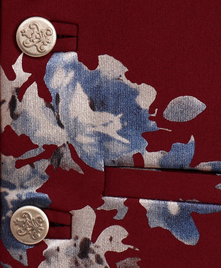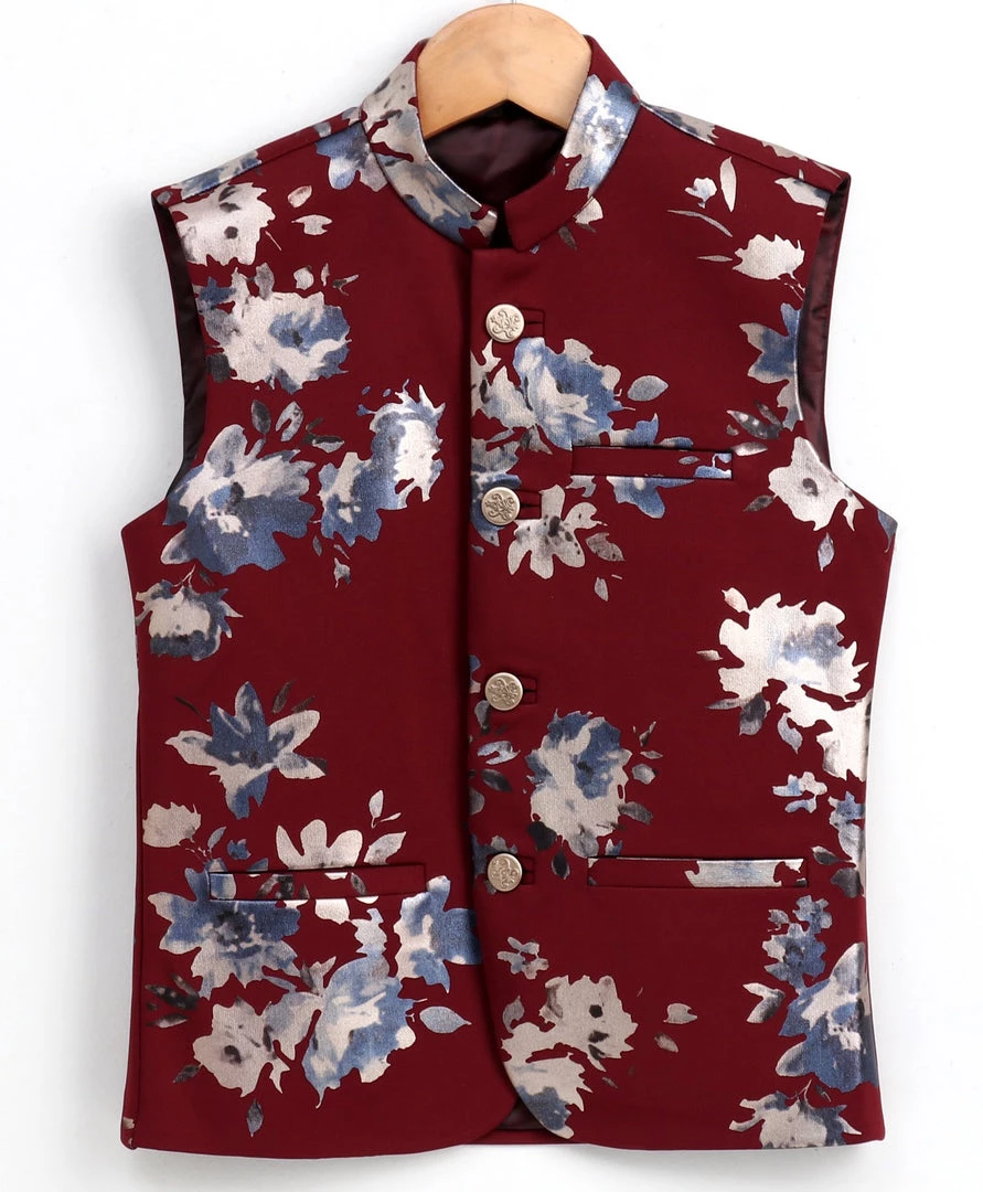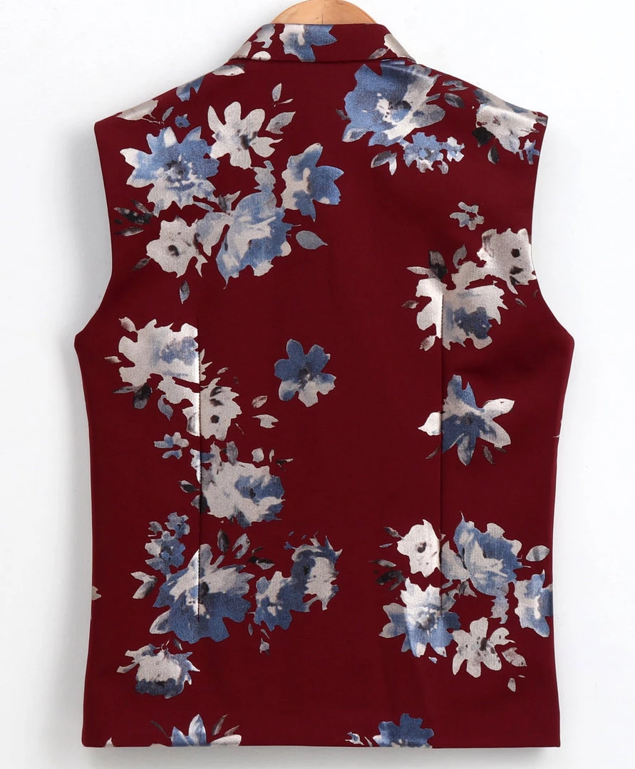 Maroon colored, blue and grey floral printed satin Nehru jacket, has a mandarin collar, a full crafted button placket, sleeveless, and three pockets, Side slits