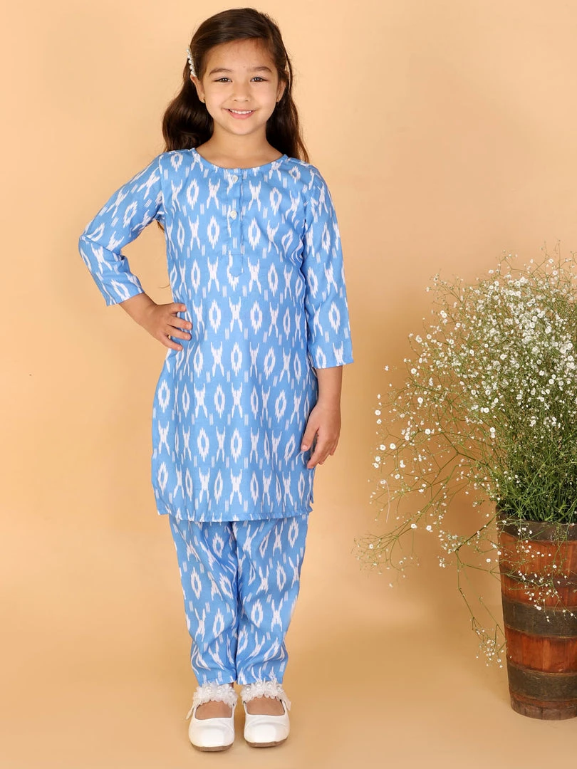 Aqua Blue Printed knee length kurta, three quarter sleeves, has round neck, button placket straight hem and side slits. Comes with Aqua Blue printed straight pant, has elasticated waistband.