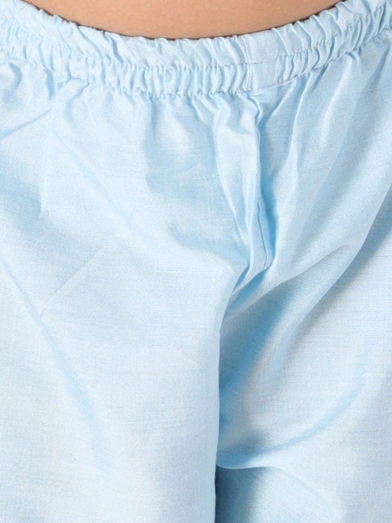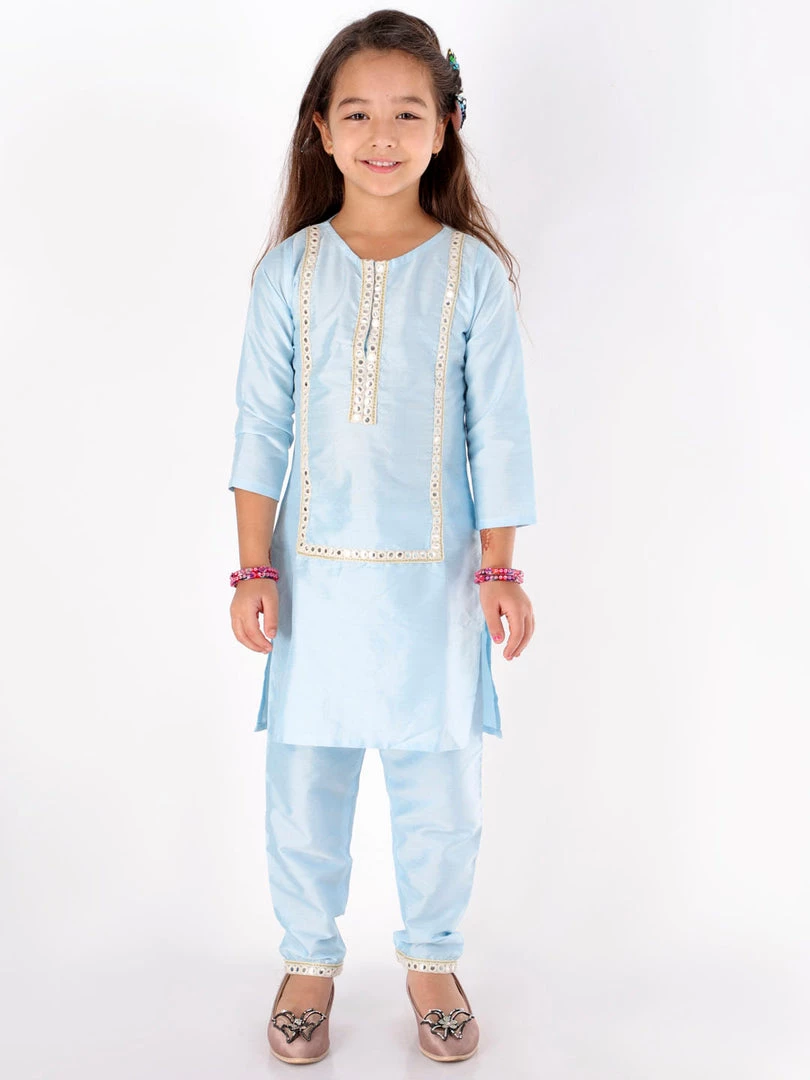 Aqua straight knee length kurta, three quater sleeves, has round neck, mirror detailing, straight hem and side slits. Comes with aqua straight pant, has elasticated waistband.