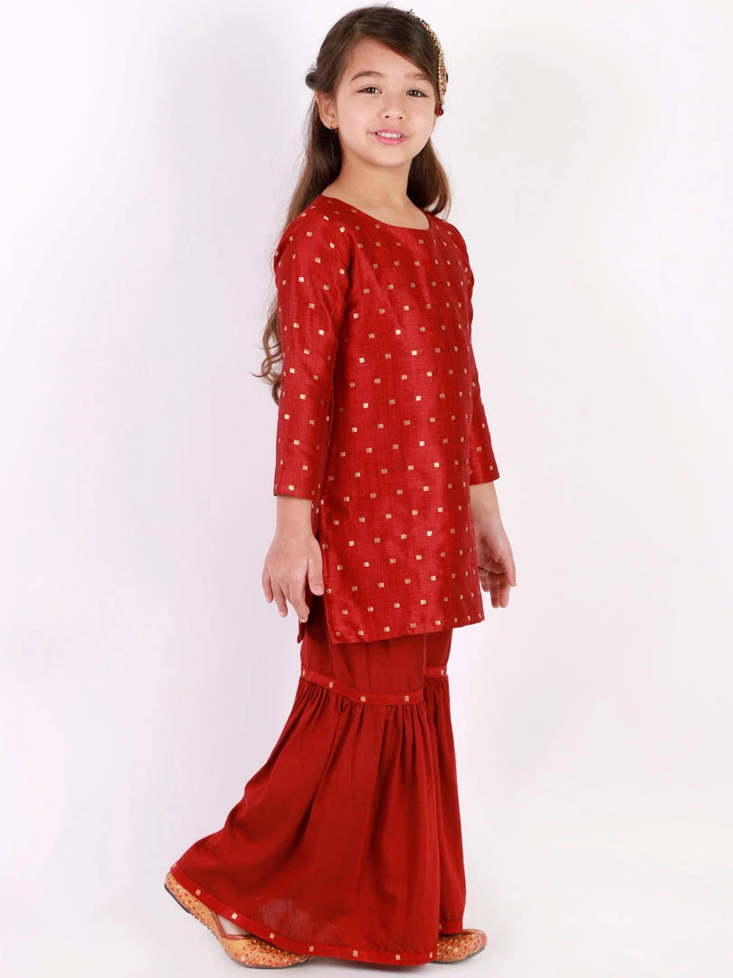 Maroon straight knee length kurta, three quarter sleeves, has round neck, Woven design, straight hem and side slits. Comes with maroon sharara, has elasticated waistband.