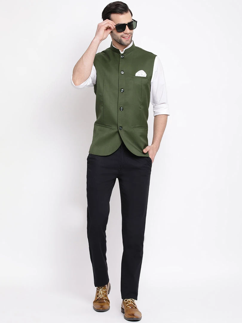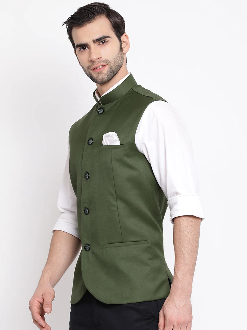 Green solid Nehru jacket, has a mandarin collar, a full button placket, sleeveless, three welt pockets