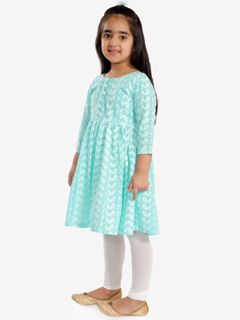 Beautifully handcrafted Kurta And Churidar Set for Girls. It made with Pure cotton fabric, has three quater sleeves, round neck, button closure, is knee length and has straight hem. The kurta has gathered waist and has all over lukhnowi chikankari embroidery. Comes with white hosiery leggings on elasticated waistband.