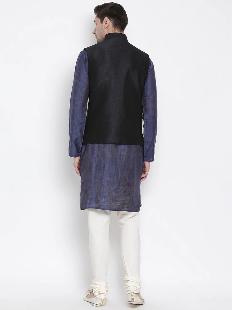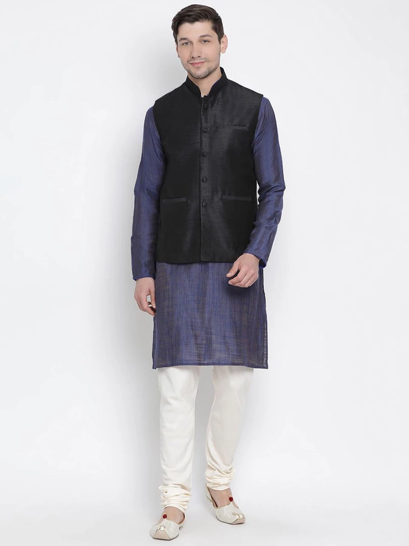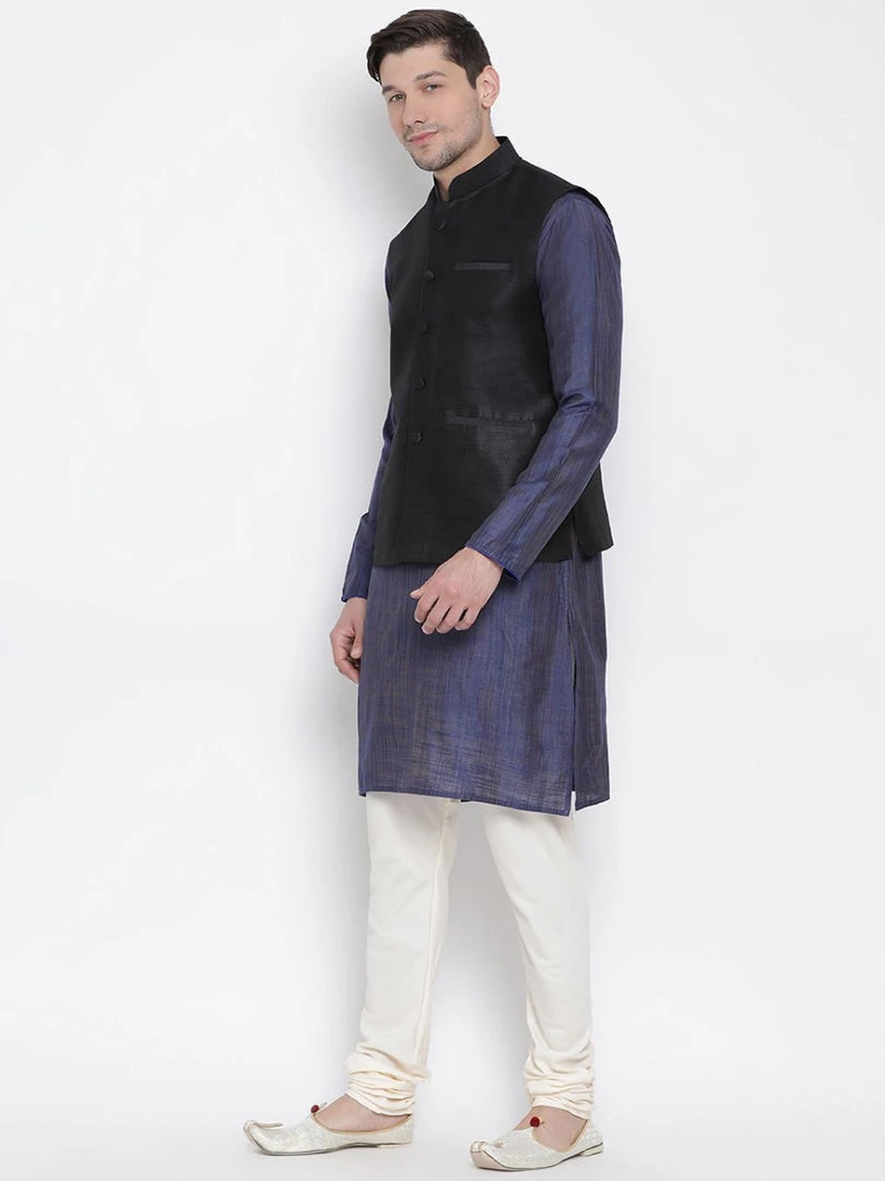 Blue textured kurta with solid churidar and black Nehru jacket