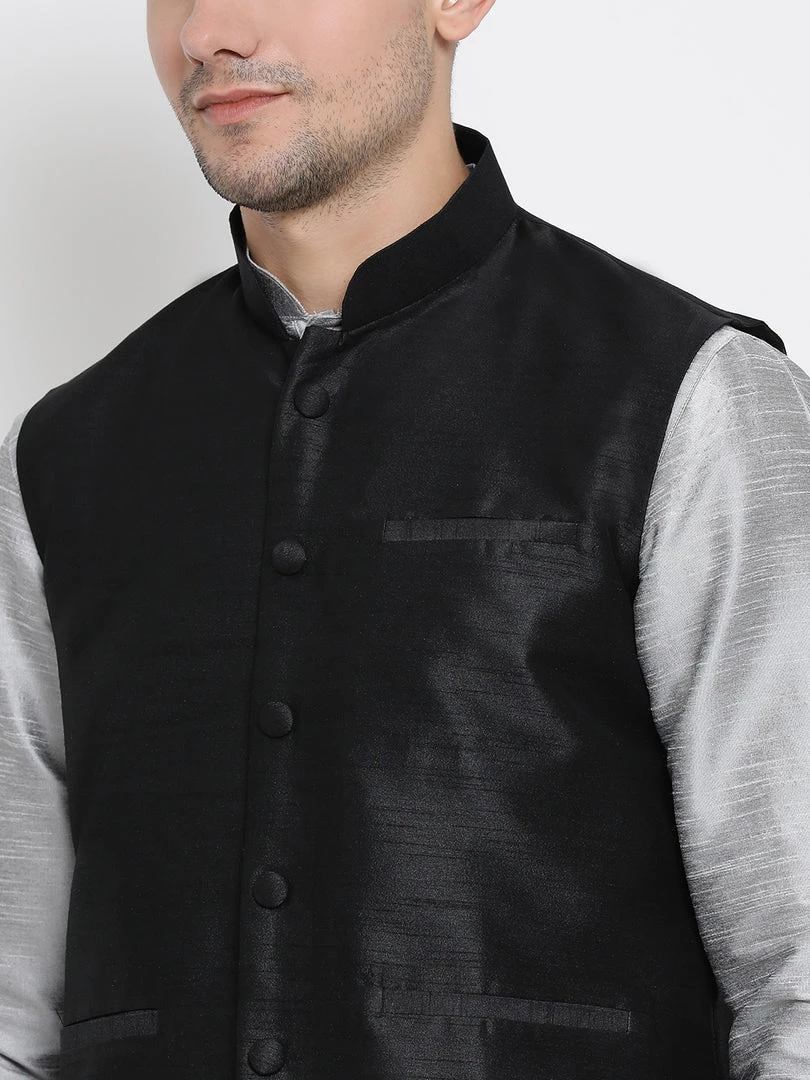 Black solid slim-fit Nehru jacket, has a mandarin collar, sleeveless, a full button placket, three pockets