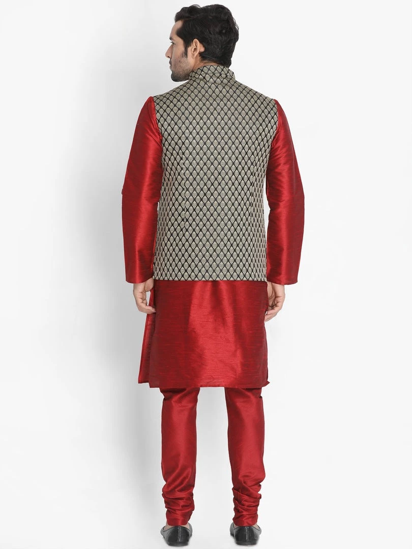 Maroon solid kurta with solid churidar and Nehru jacket