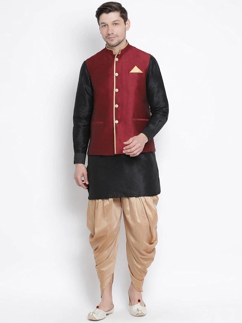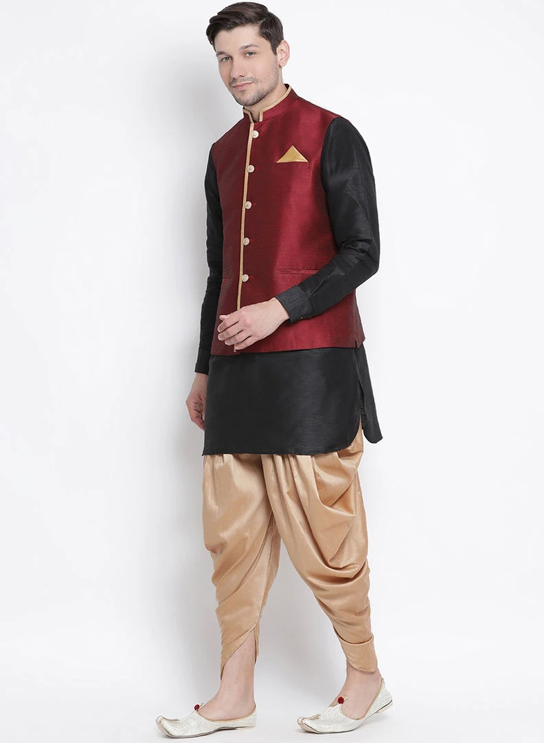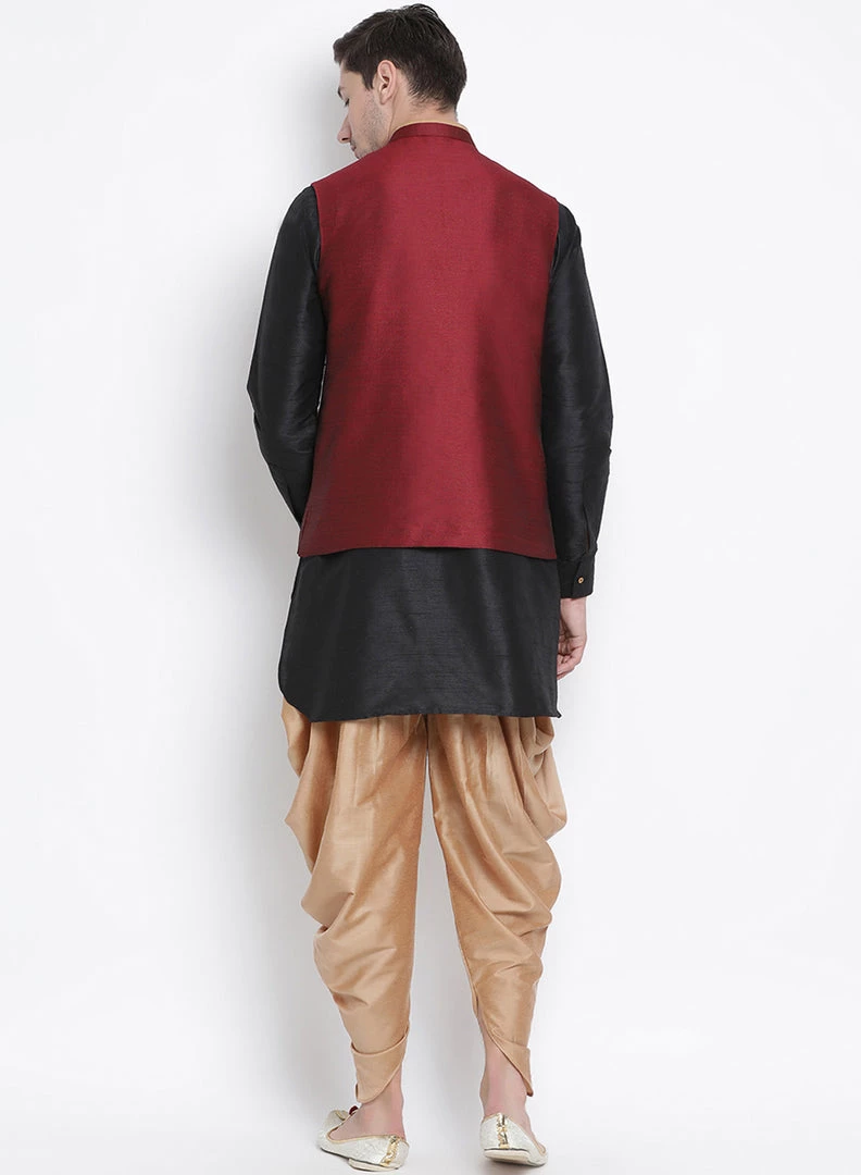 Black solid kurta with solid dhoti pant and maroon Nehru jacket
