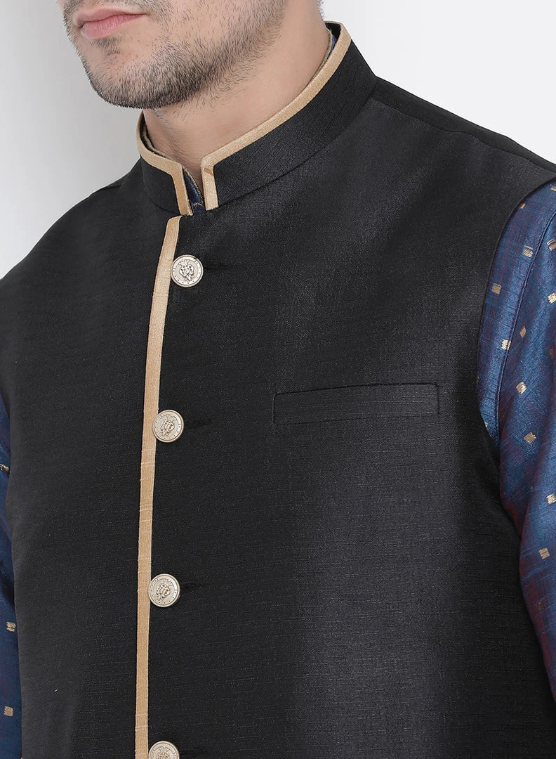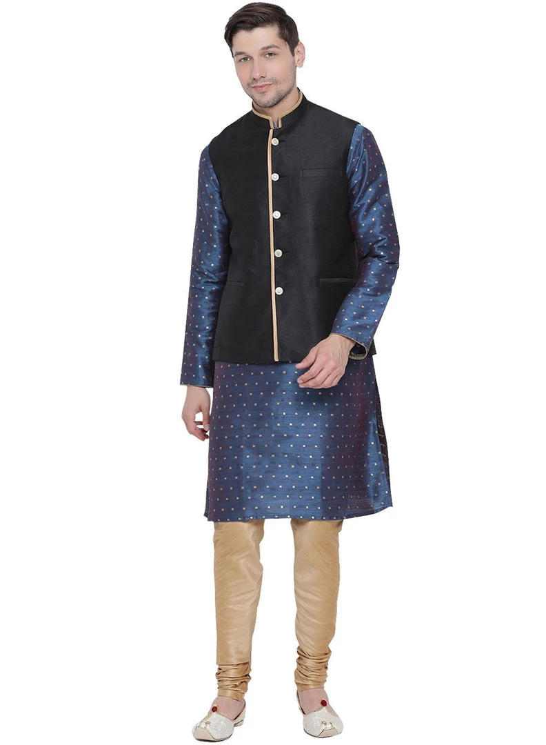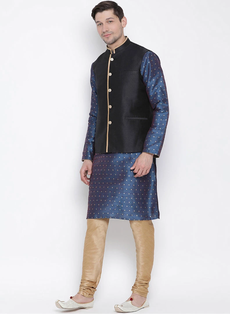Blue and gold self-design woven kurta with solid churidar and black Nehru jacket