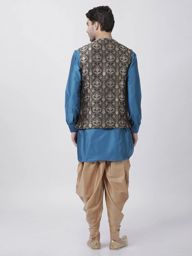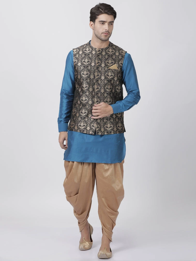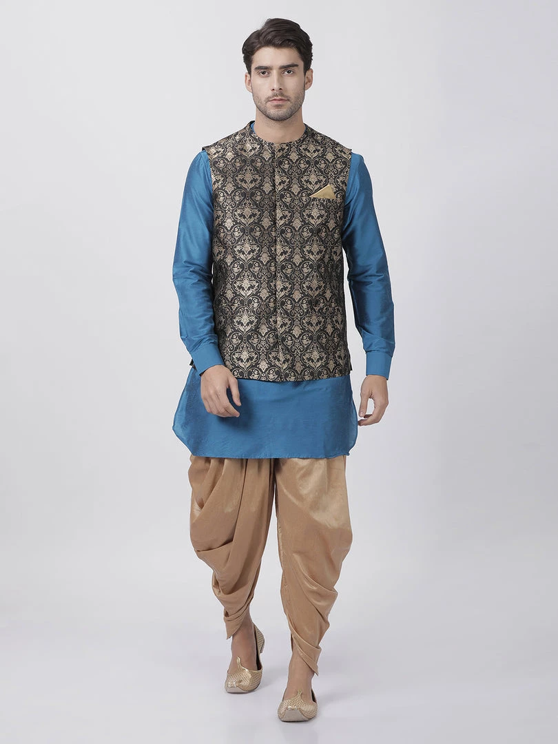 Firozi Blue Solid kurta with Gold solid Dhoti Pant and Black Nehru jacket