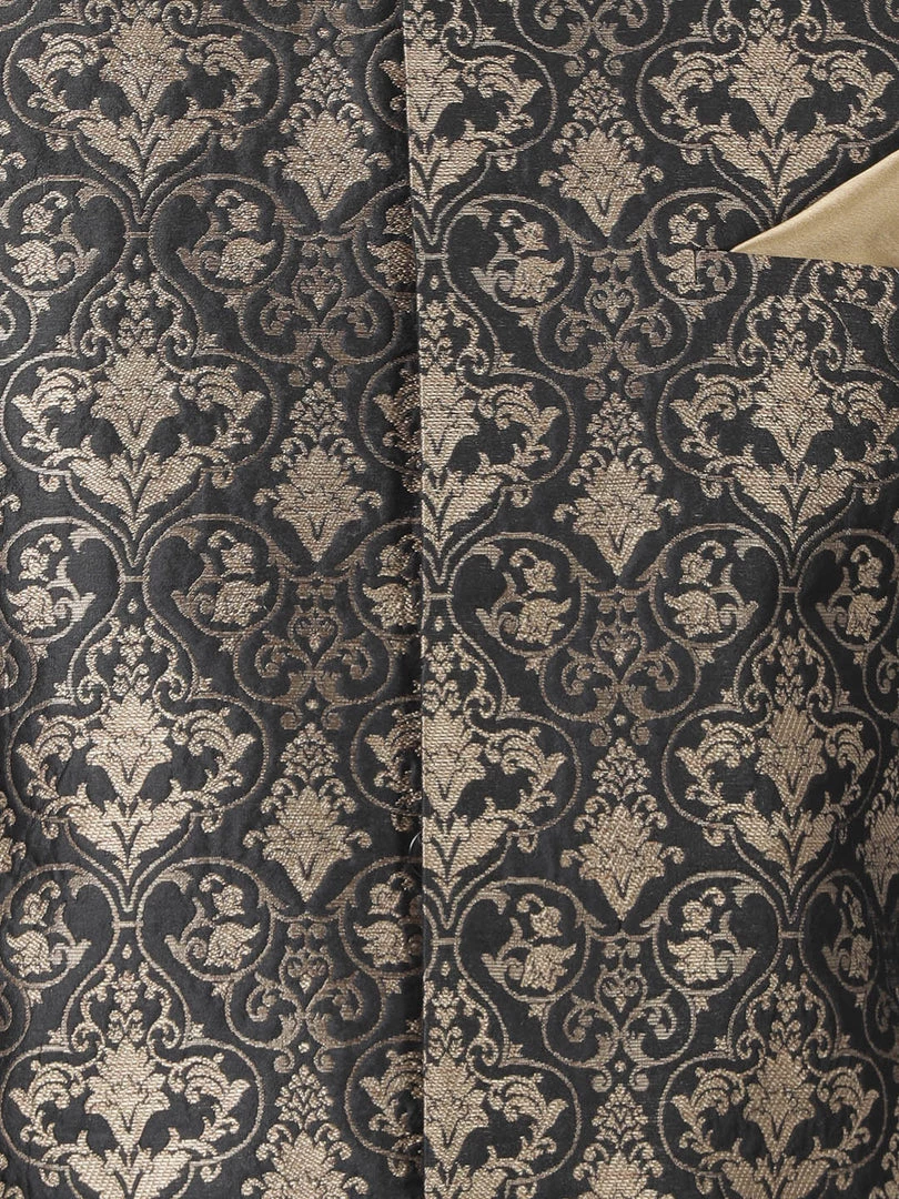 Black Woven Nehru jacket has a Round Neck, sleeveless, One Pocket with a pocket square, straight hem.
