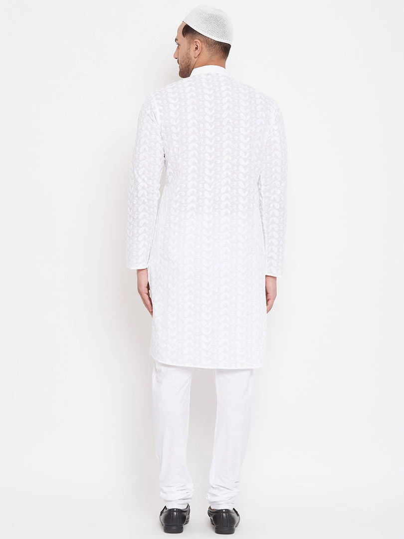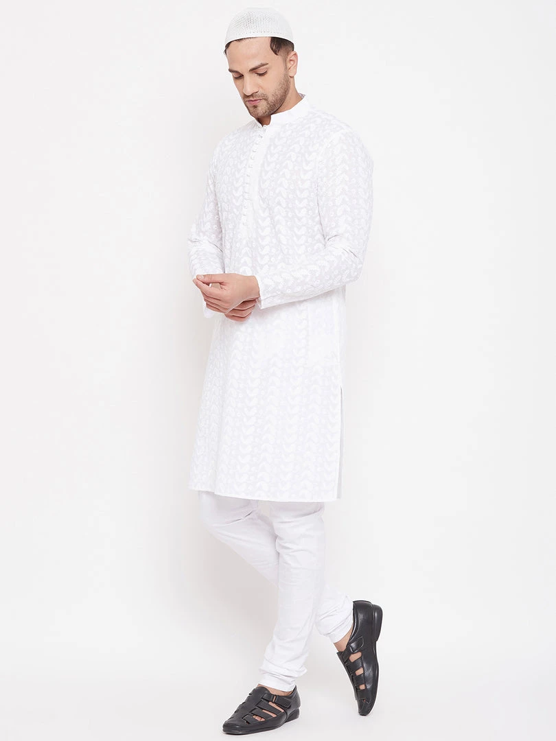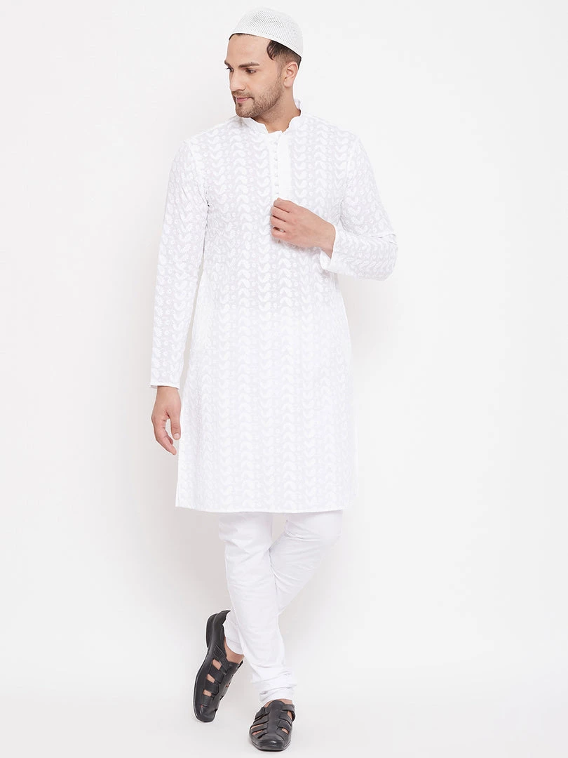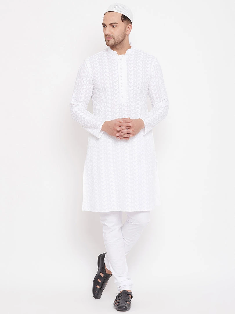 White chikankari straight knee length kurta, has a mandarin collar, long sleeves, button placket, straight hem.