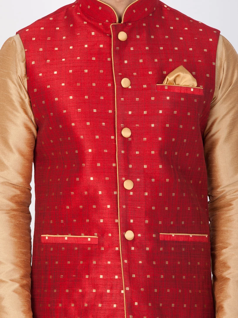 Maroon jacquard nehru jacket, sleeveless, has a mandarin collar, front button placket and welt pocket with pocket square.