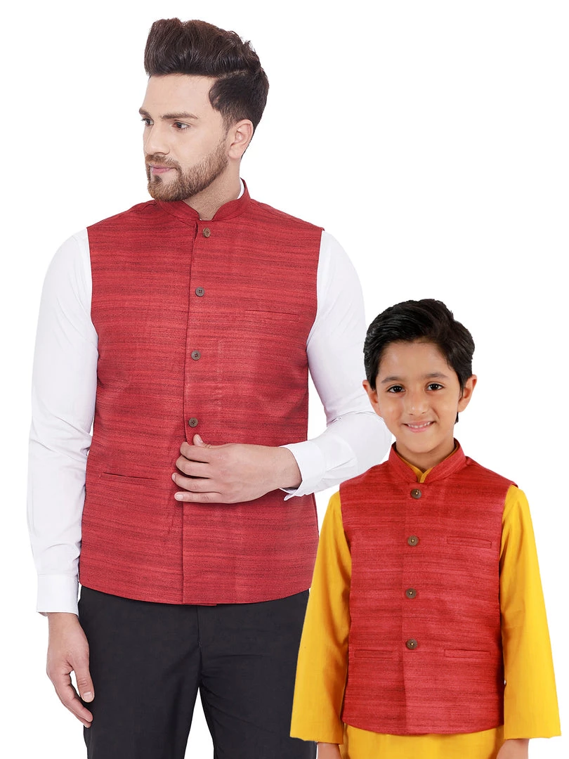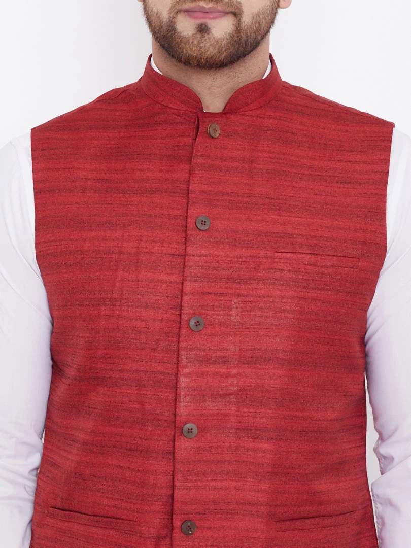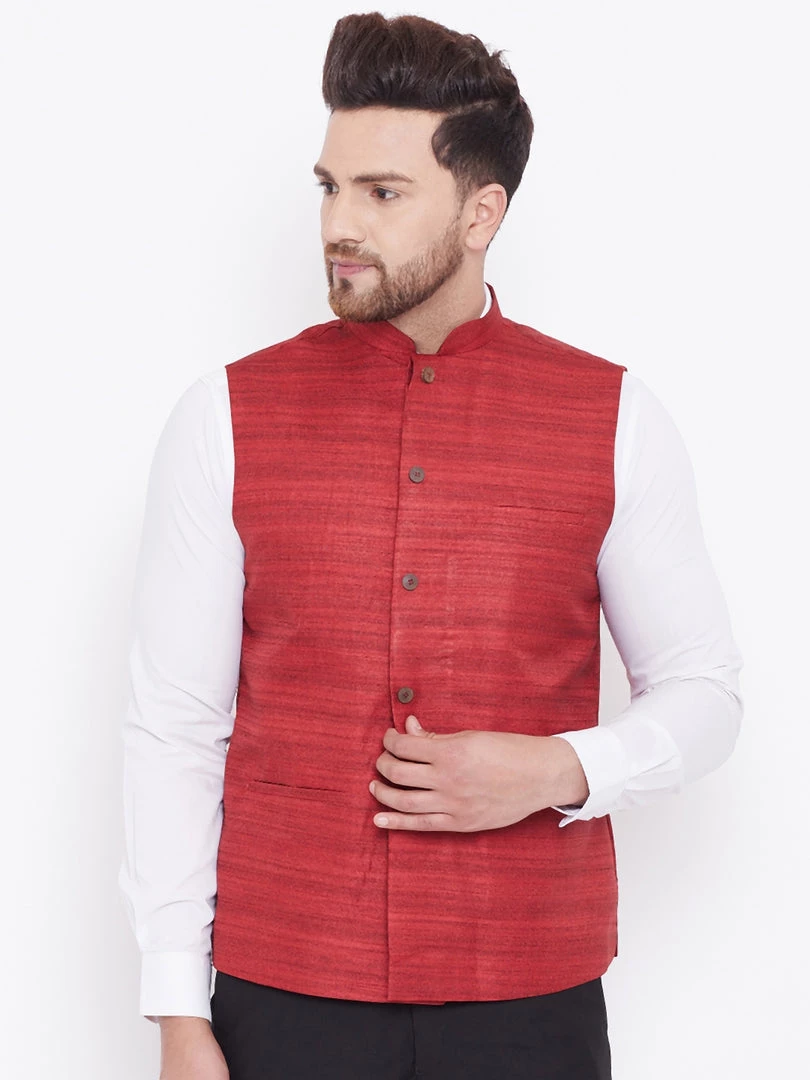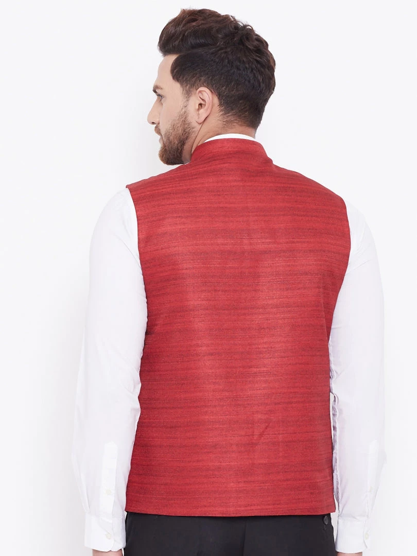 Maroon woven slim-fit nehru jacket, has a mandarin collar, sleeveless, a full button placket, one welt pocket, side slits and straight hem