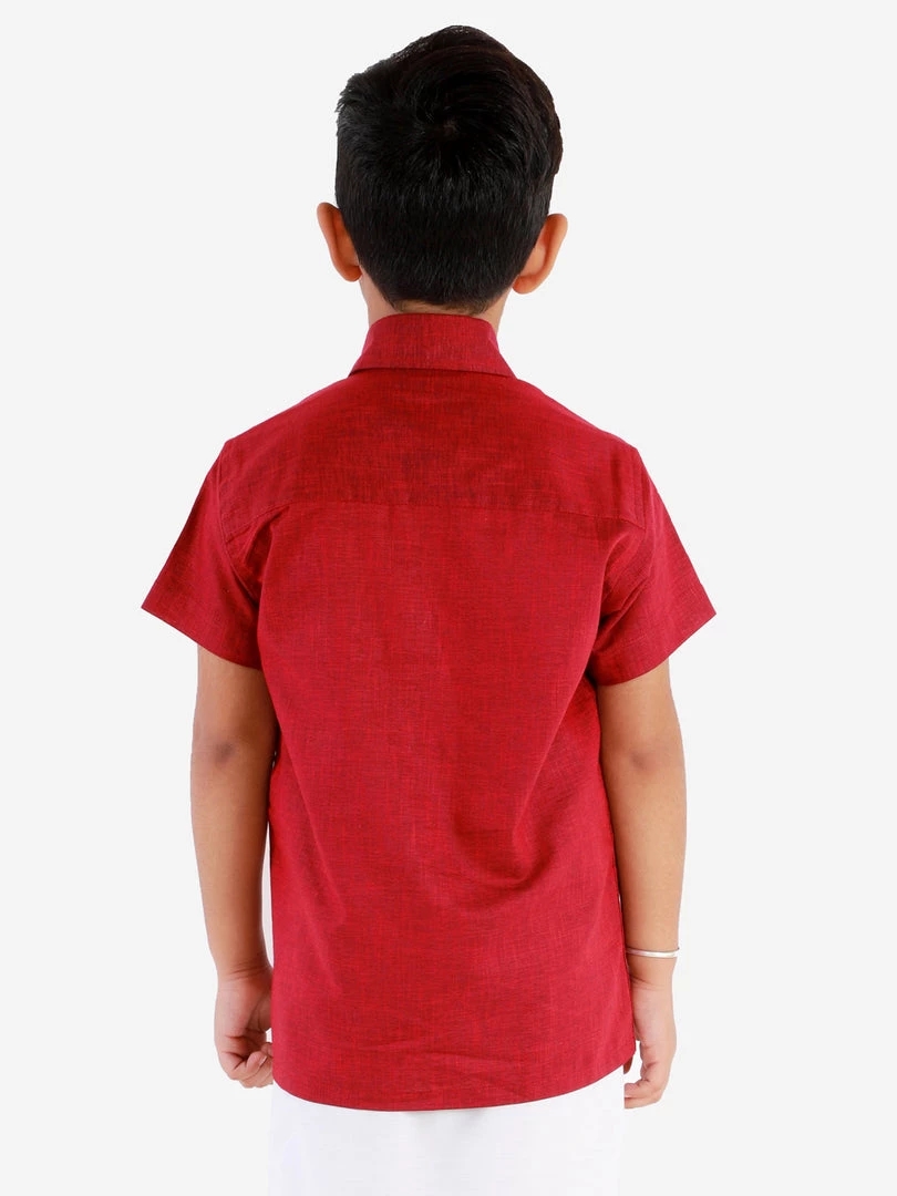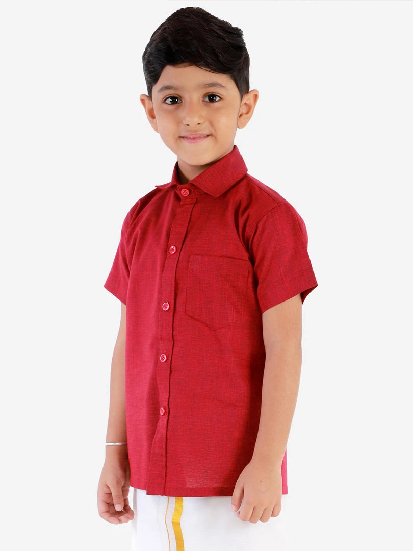 Maroon solid regular shirt, has a shirt collar, half sleeves, straight hem, full front button placket, side slits and a patch pocket