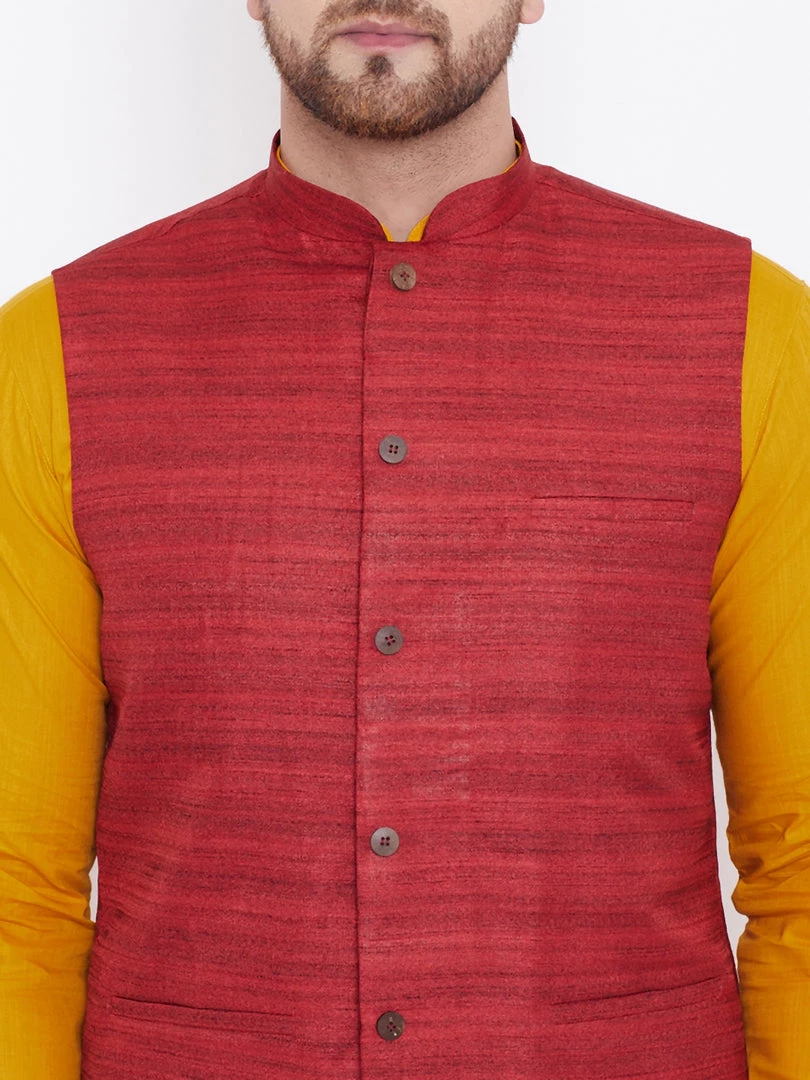 Maroon woven Nehru jacket, Regular style, straight waist-length Nehru jacket, has a Mandarin collar, Sleeveless, Straight hem, and one pocket.
