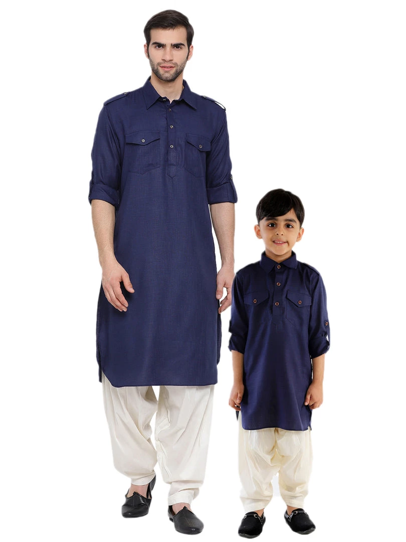 Blue solid pathani kurta, has a shirt collar, long roll up sleeves, shoulder tabs, button placket, curved hem, two patch pockets and side slits