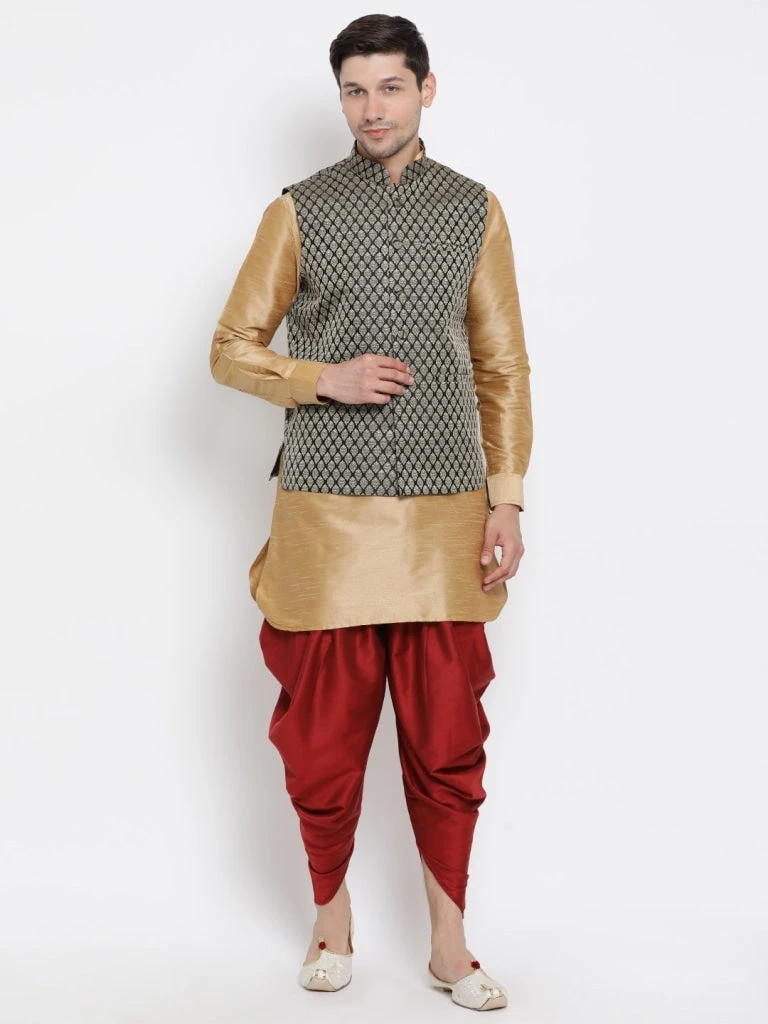Black and Gold woven Nehru jacket, Regular style, straight waist-length Nehru jacket, has a Mandarin collar, Sleeveless, Straight hem, and one pocket.