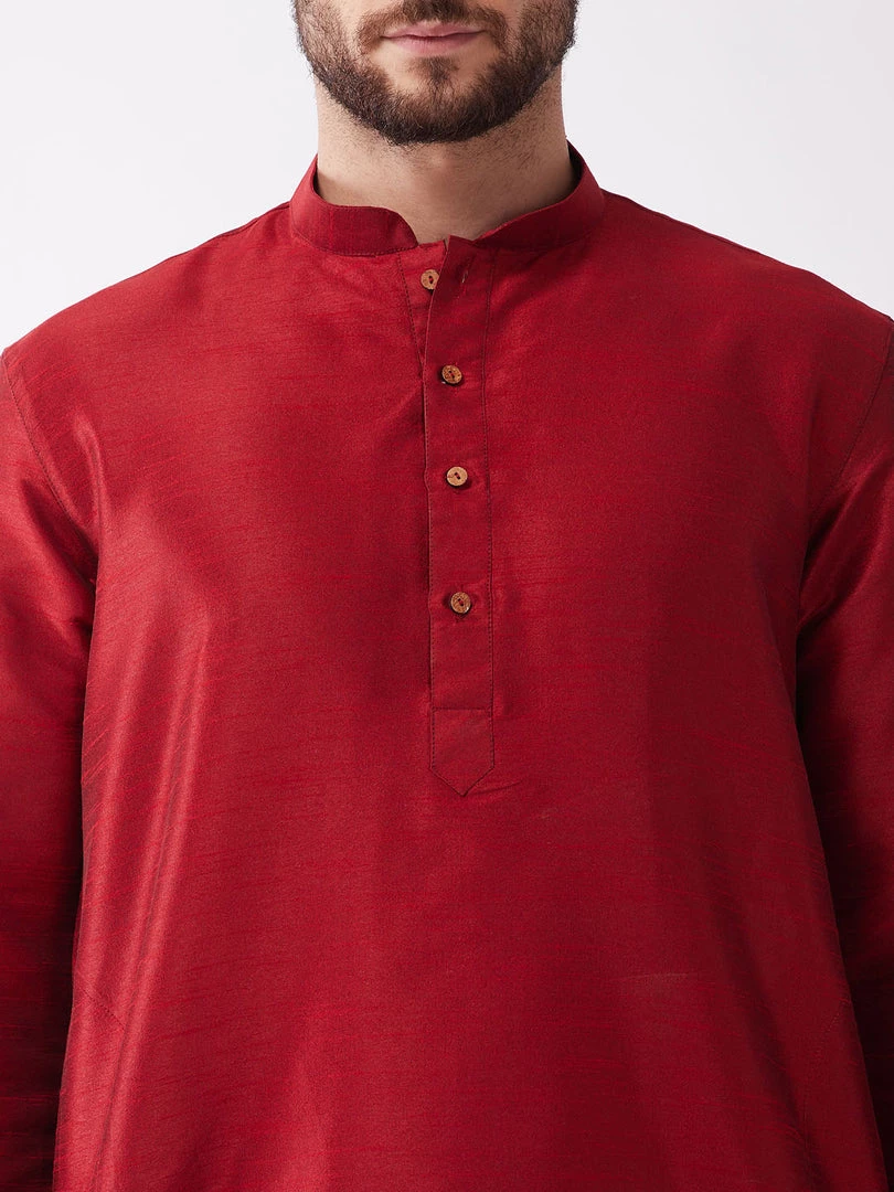 Maroon solid straight knee-length silk blend kurta, has a mandarin collar, long sleeves, button placket, straight hem