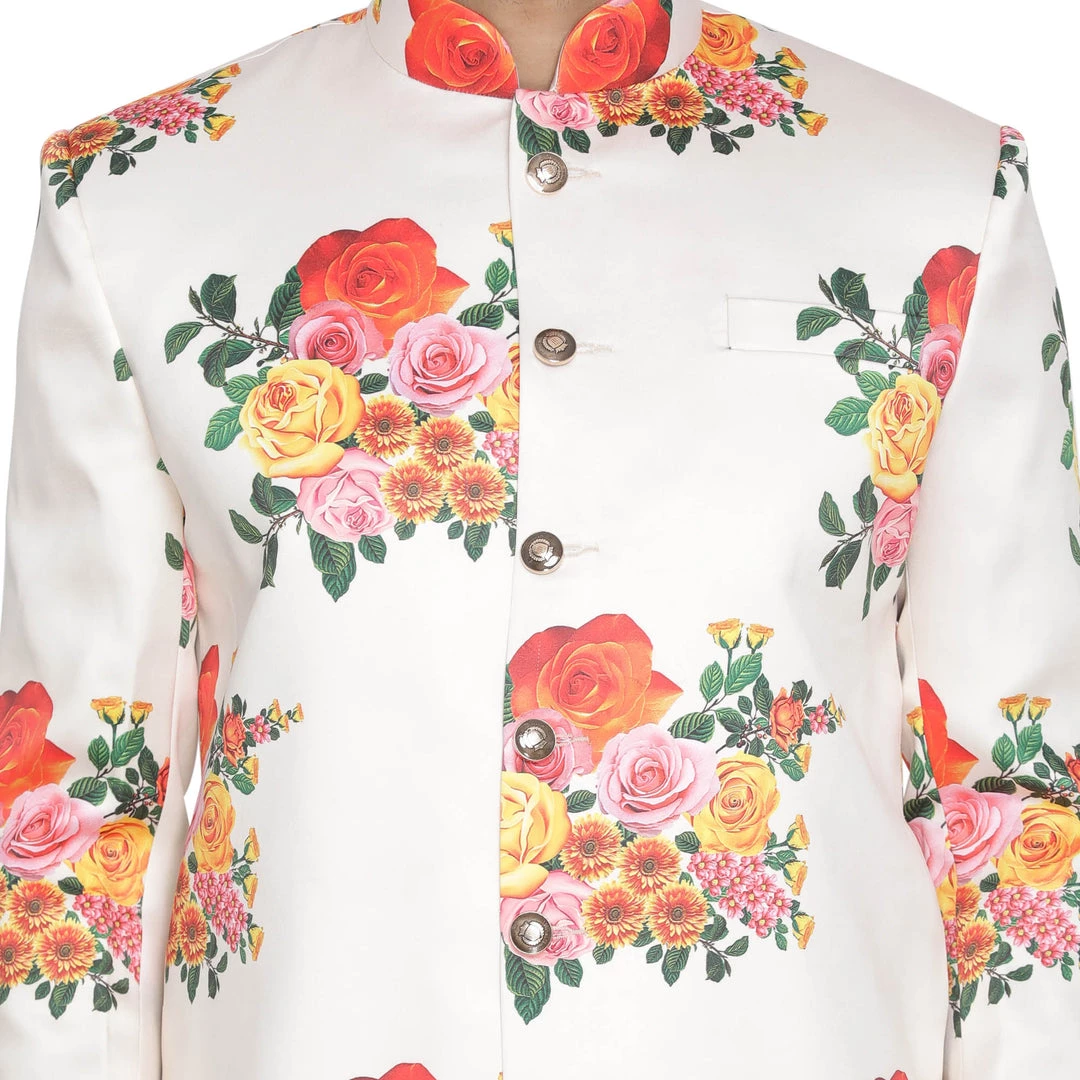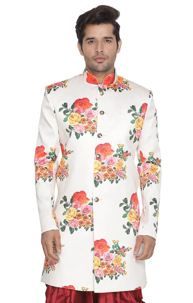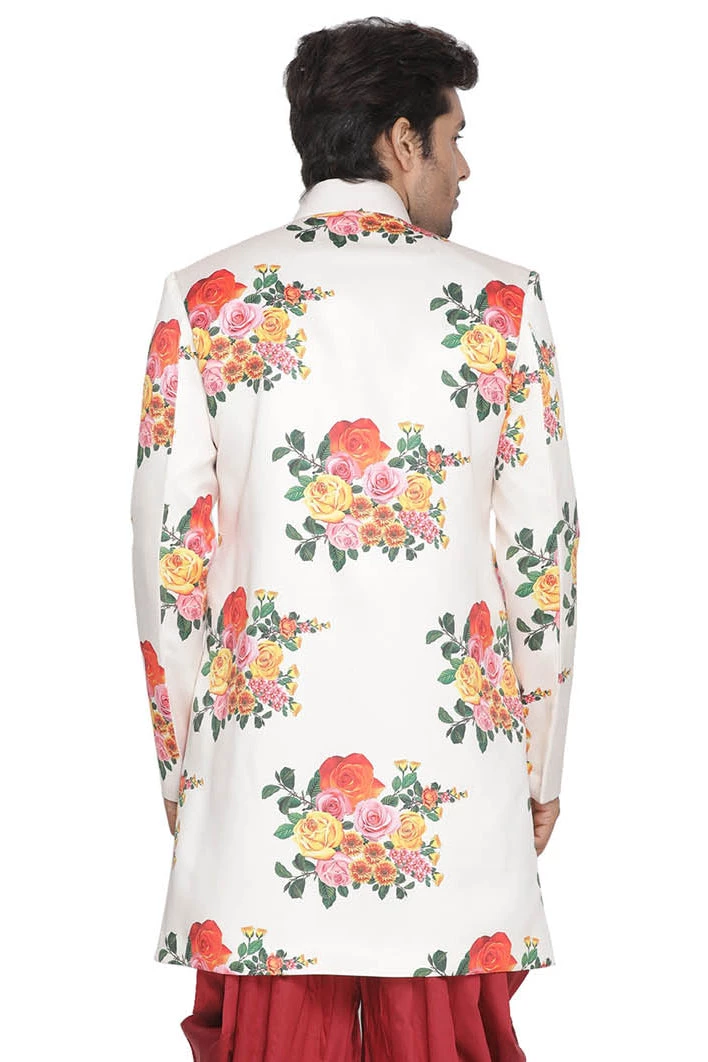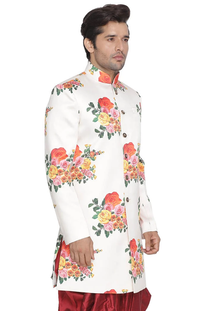 Off-white floral printed sherwani, has a mandarin collar, a front button placket, long sleeves, a welt pocket, straight hem, side slits, an attached lining. Comes with pocket square.