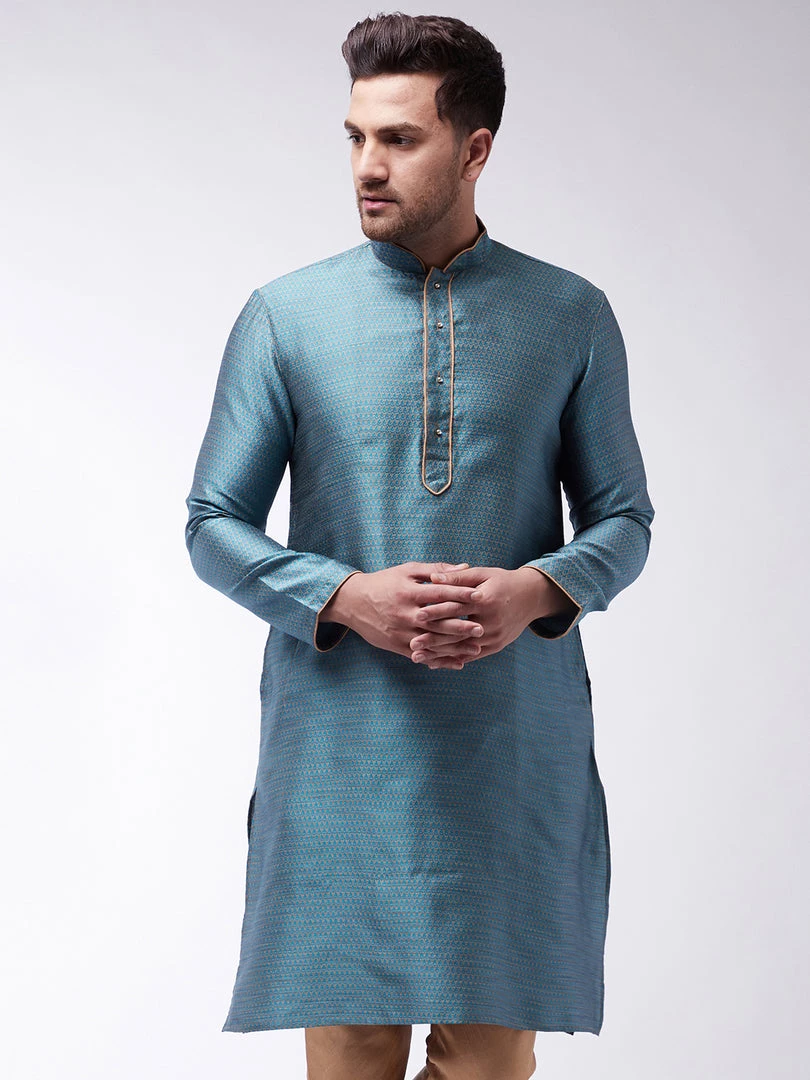 Aqua and beige woven design banarasi jacquard straight knee-length kurta, has a mandarin collar, golden piping detailing, button placket, long sleeves, a straight hem, and side slits.