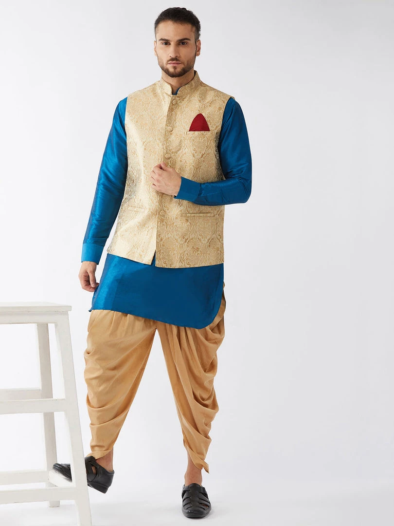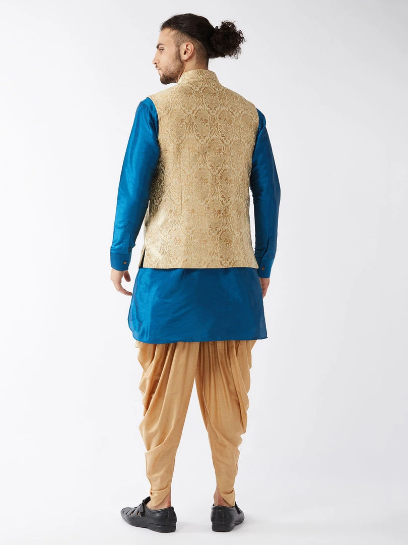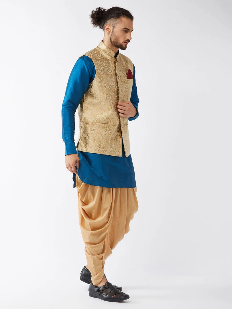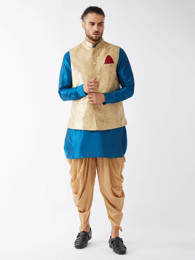 Turquoise blue solid kurta with solid dhoti pant and beige Nehru jacket