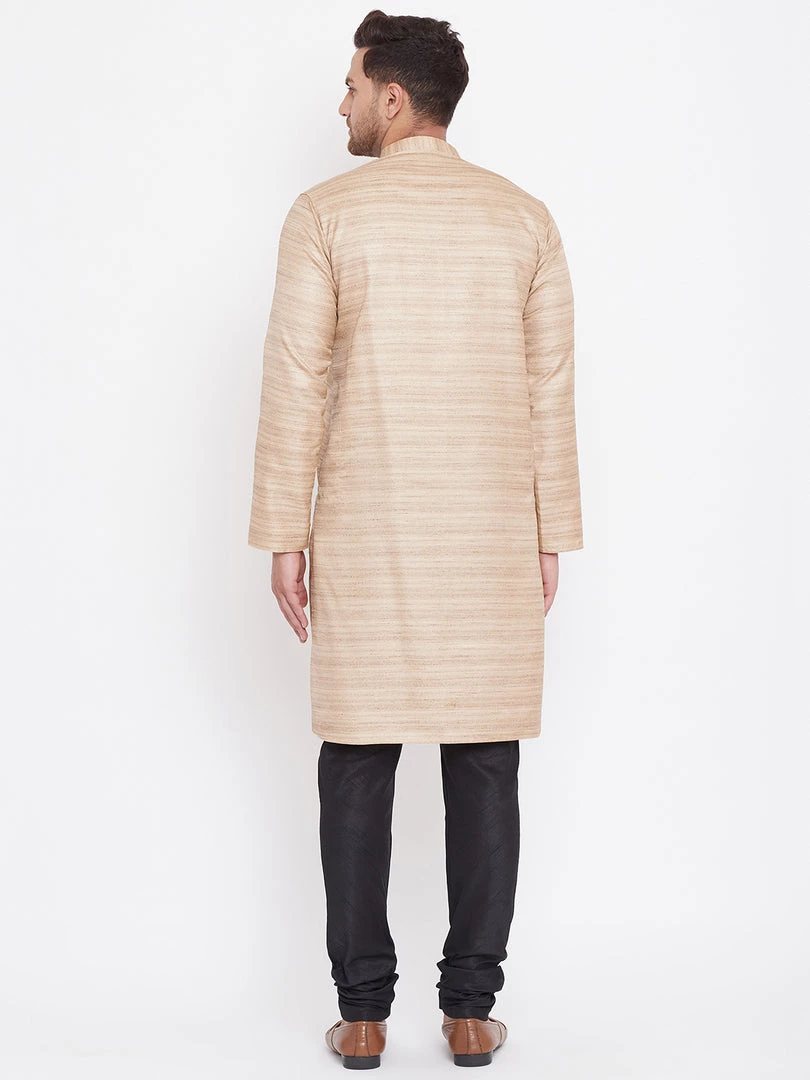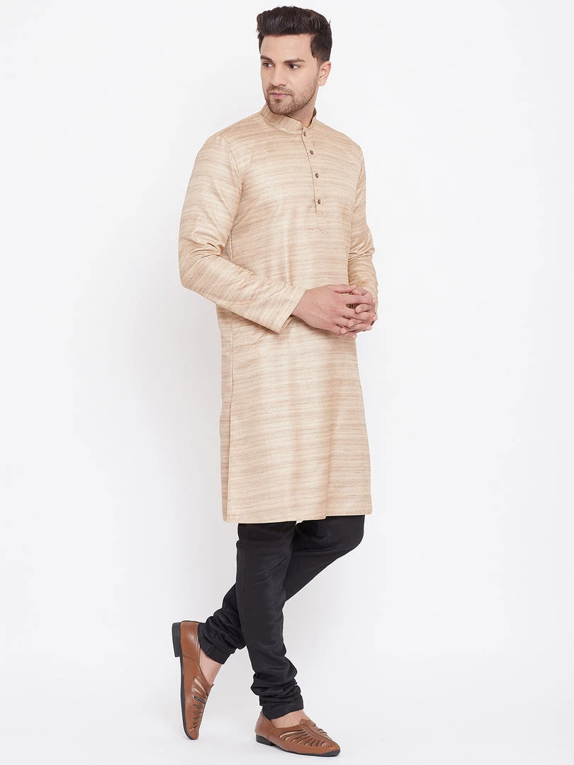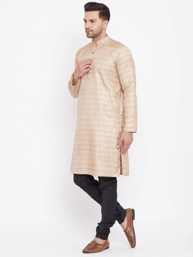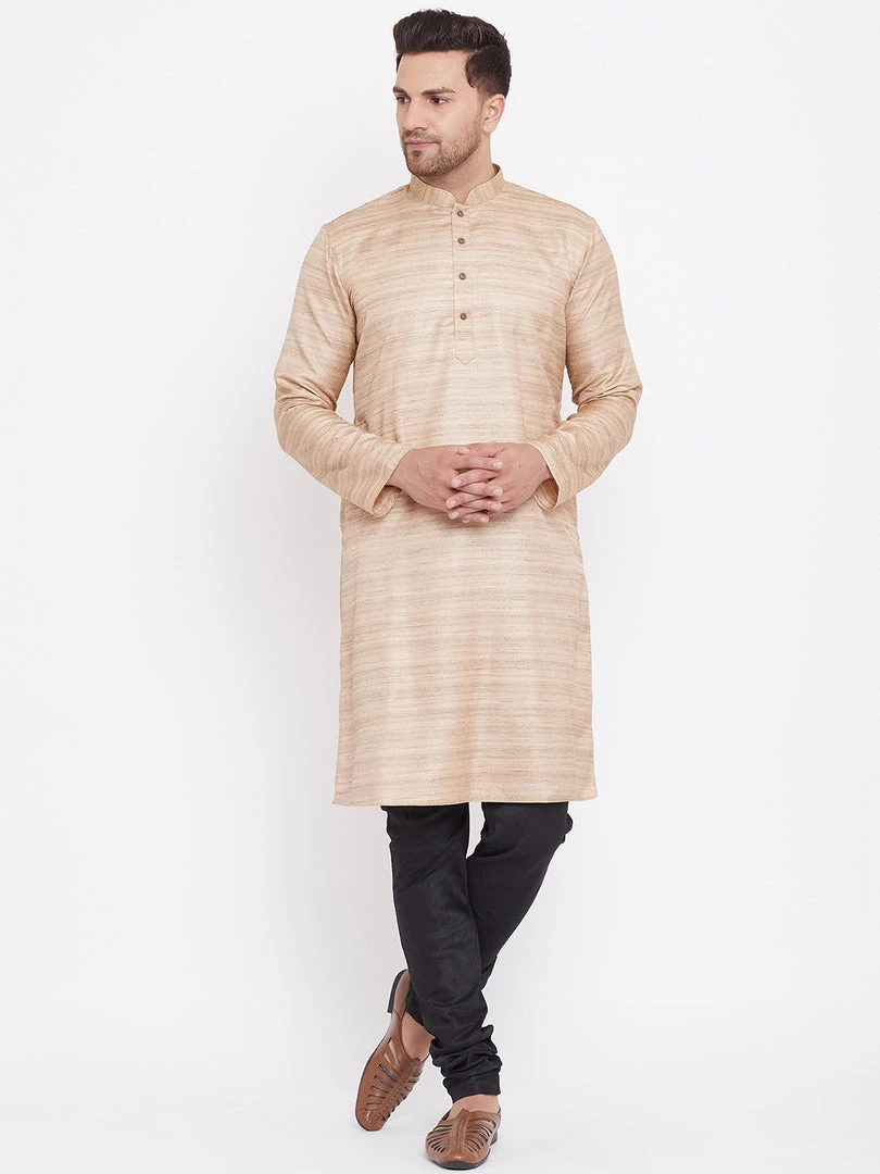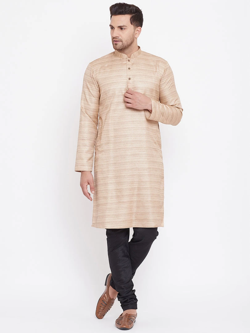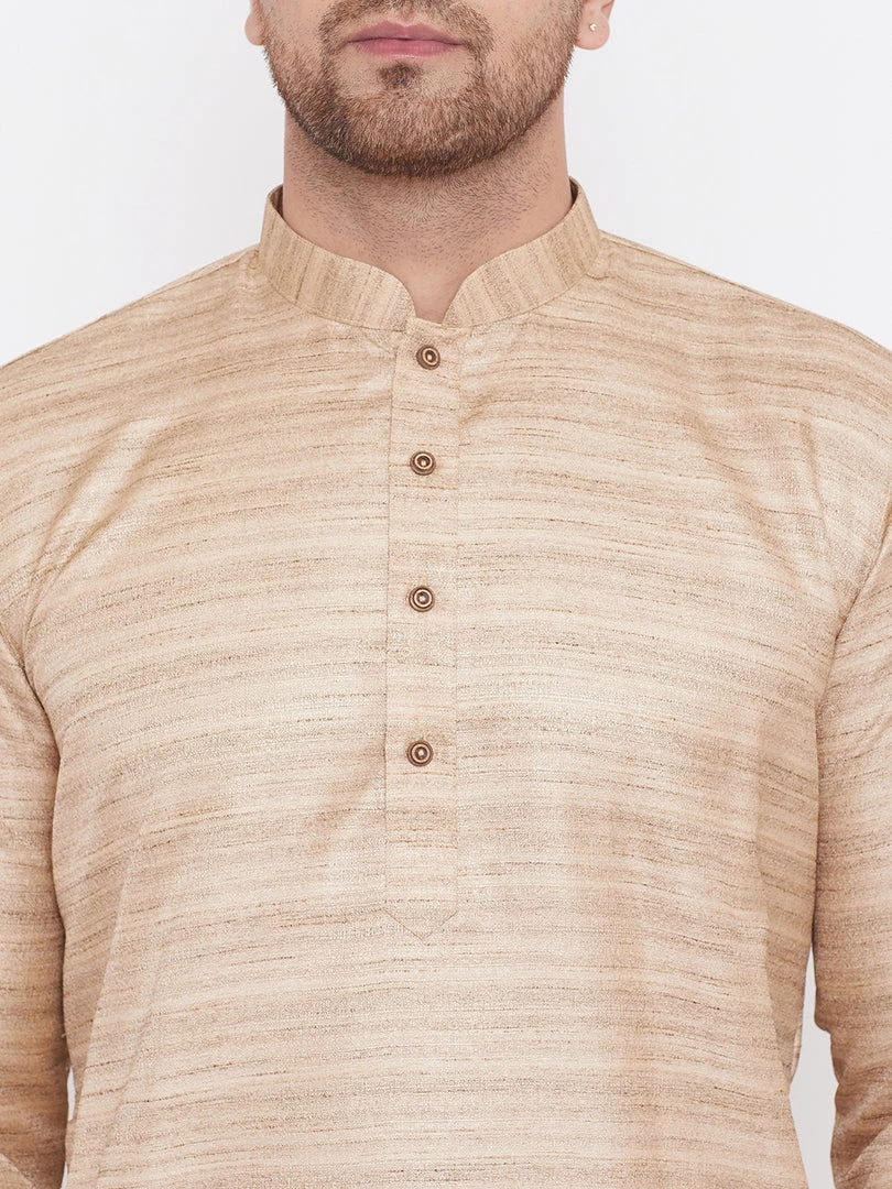 Beige silk blend straight knee length kurta, has a mandarin collar, long sleeves, button placket, straight hem.
