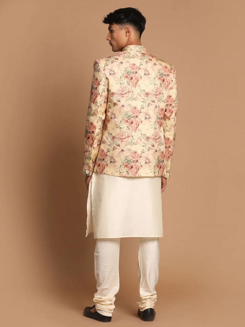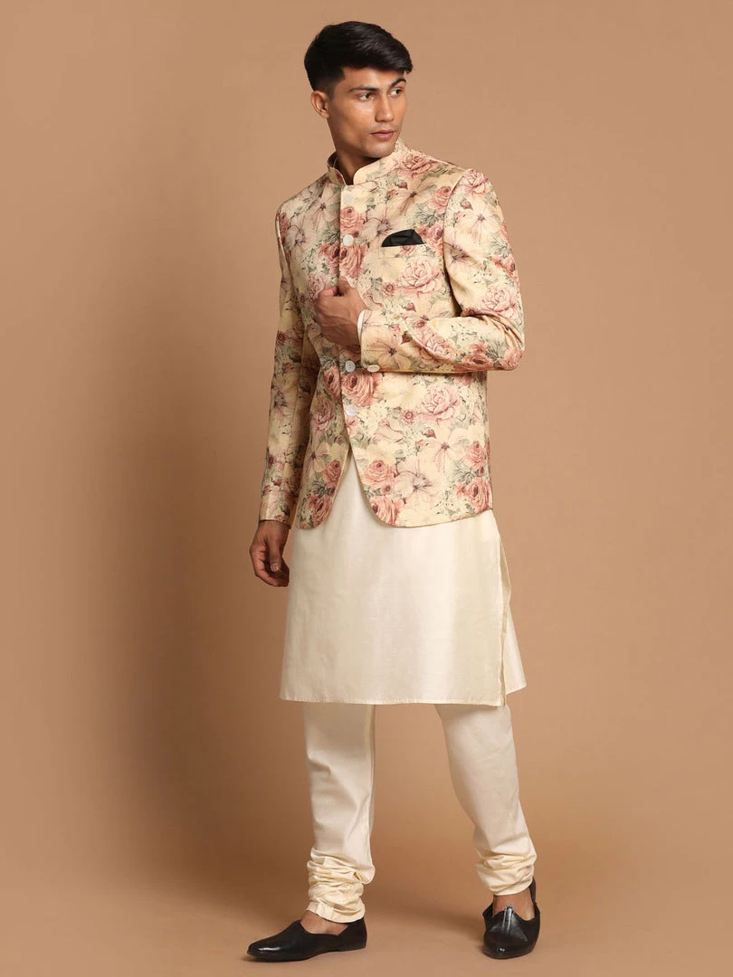 Cream Solid kurta with solid churidar and printed Beige Color Nehru jacket