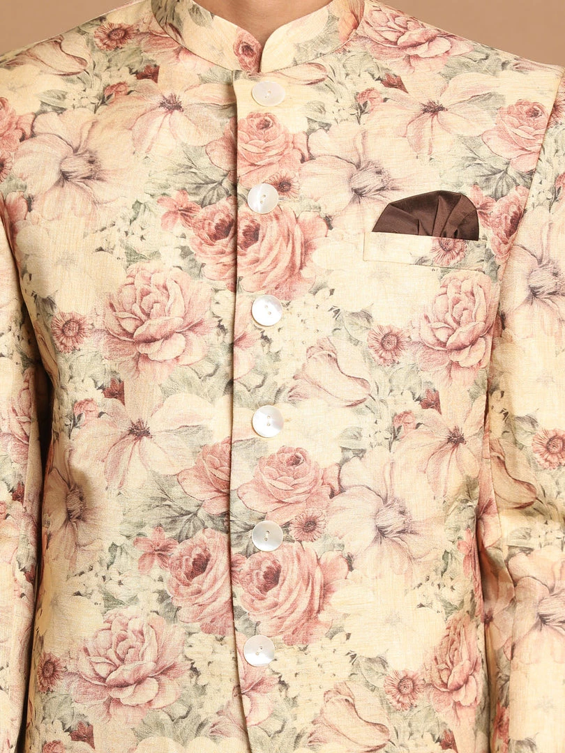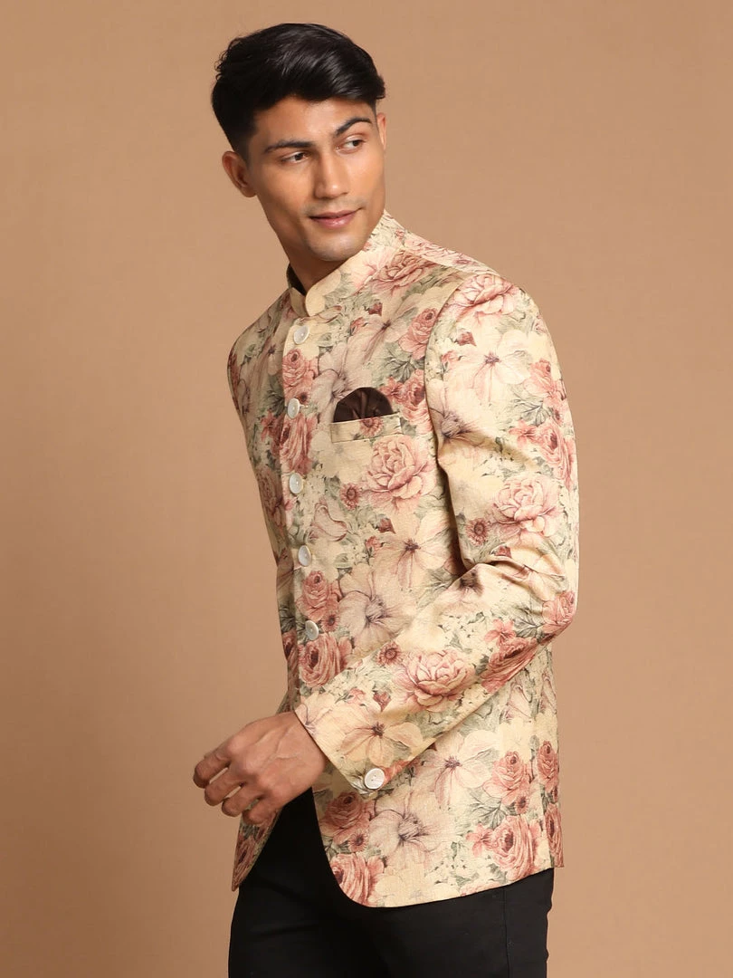 Beige printed Nehru jacket, has a mandarin collar, a full button placket, long sleeves with pocket square and three welt pocket.