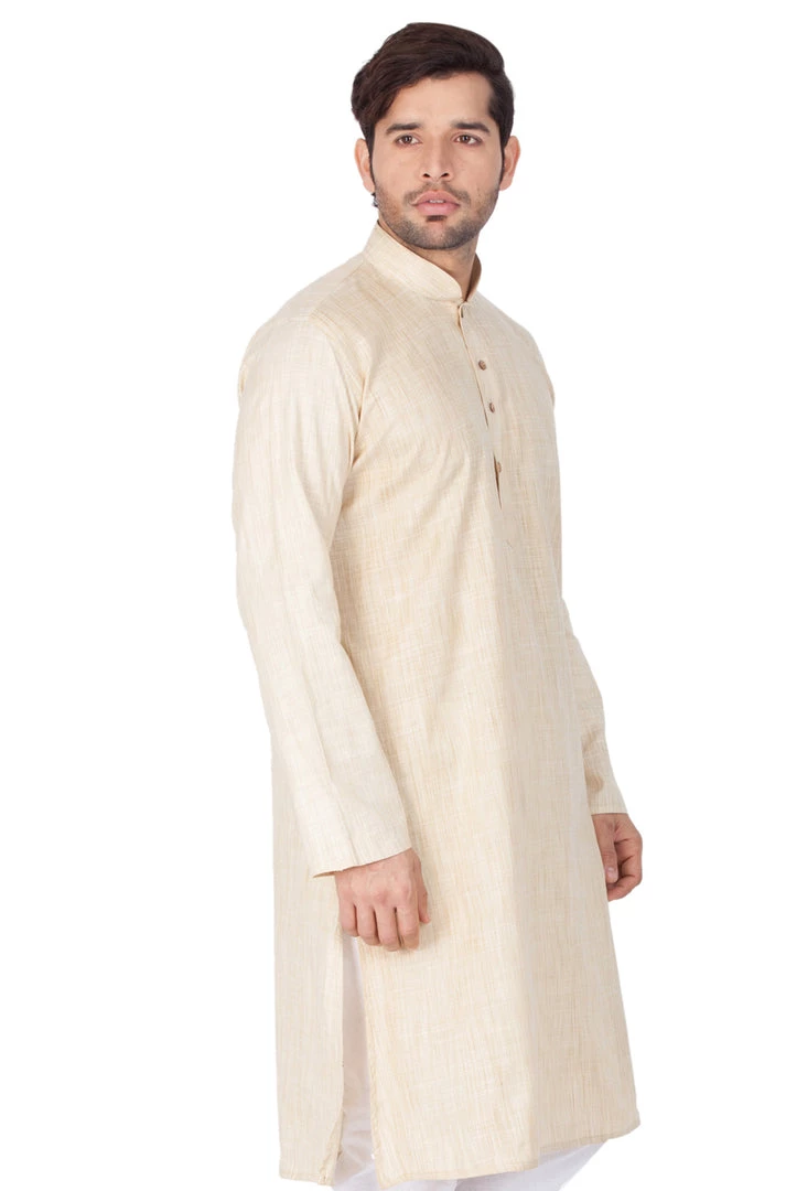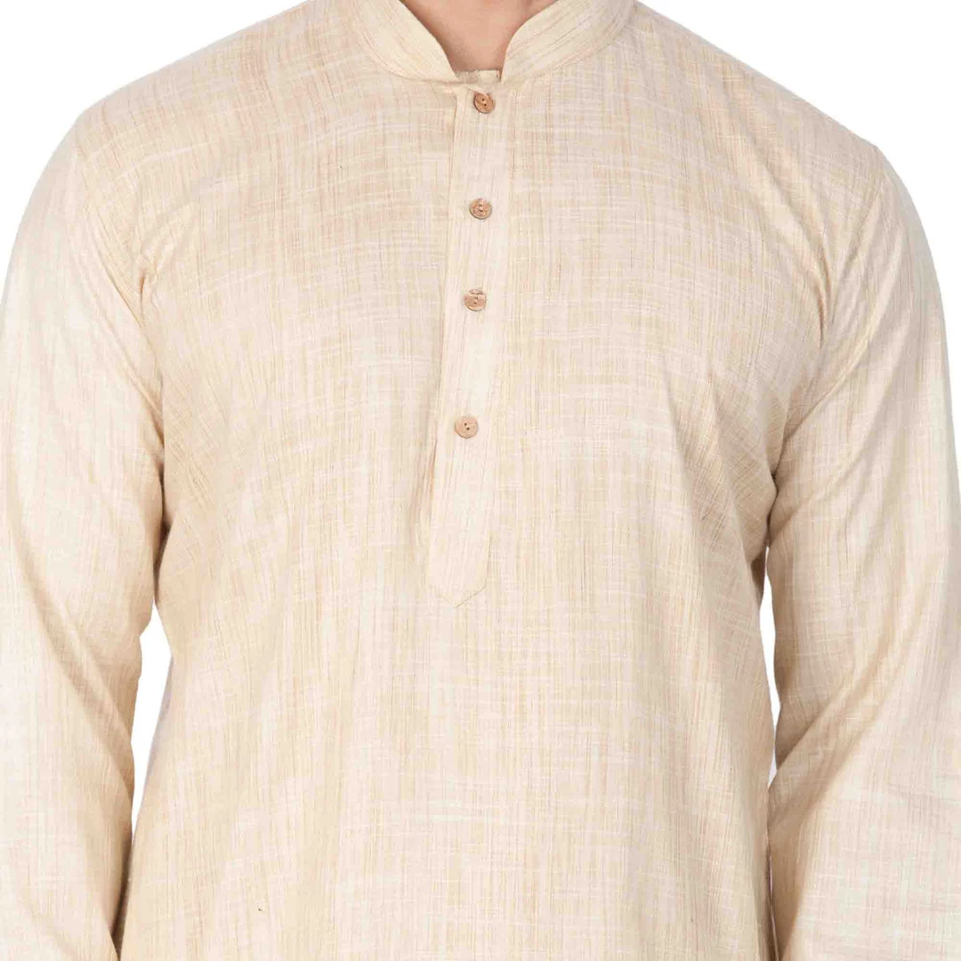 Beige solid straight kurta, has a mandarin collar, long sleeves, button placket, straight hem, and side slits.