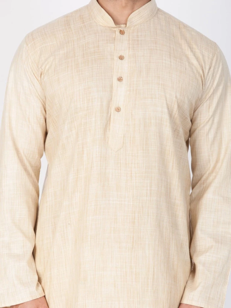 Beige solid straight knee-length kurta, has a mandarin collar, long sleeves, button placket, straight hem.
