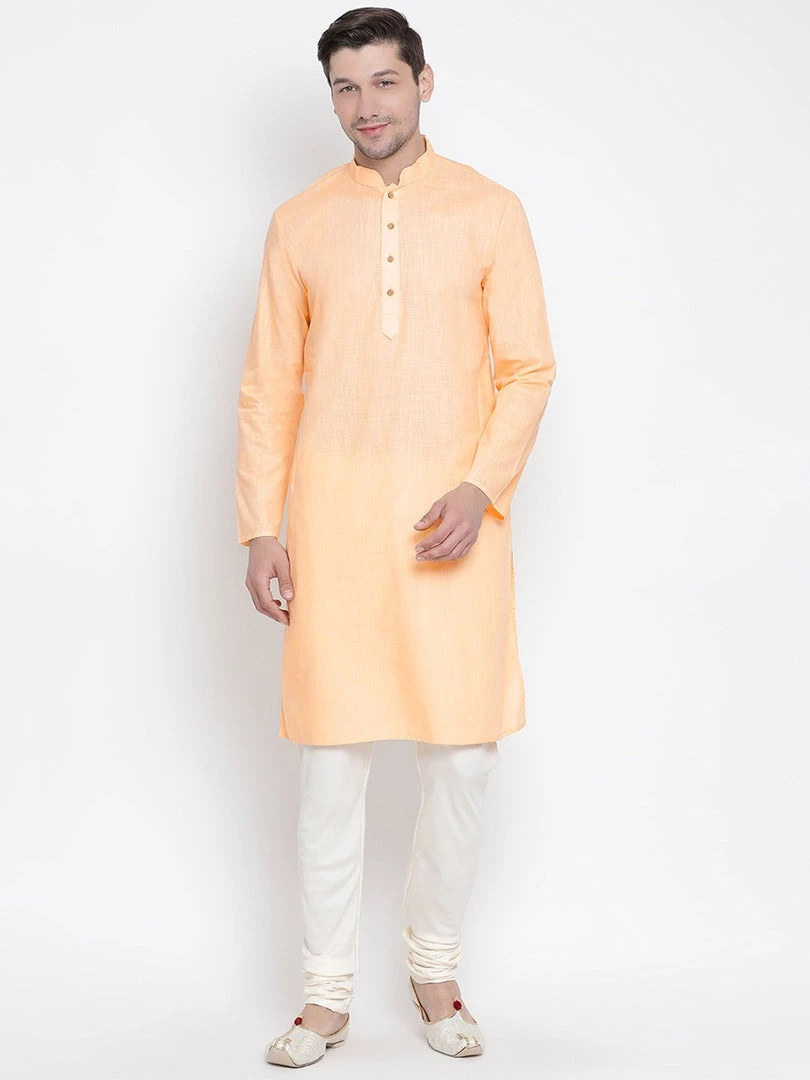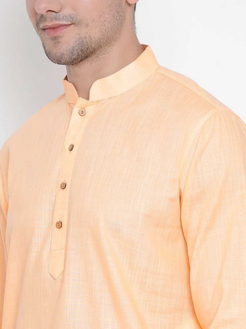 Peach solid straight knee length kurta, has a mandarin collar, button placket, long sleeves, straight hem