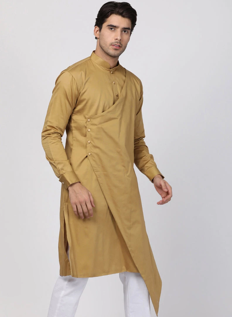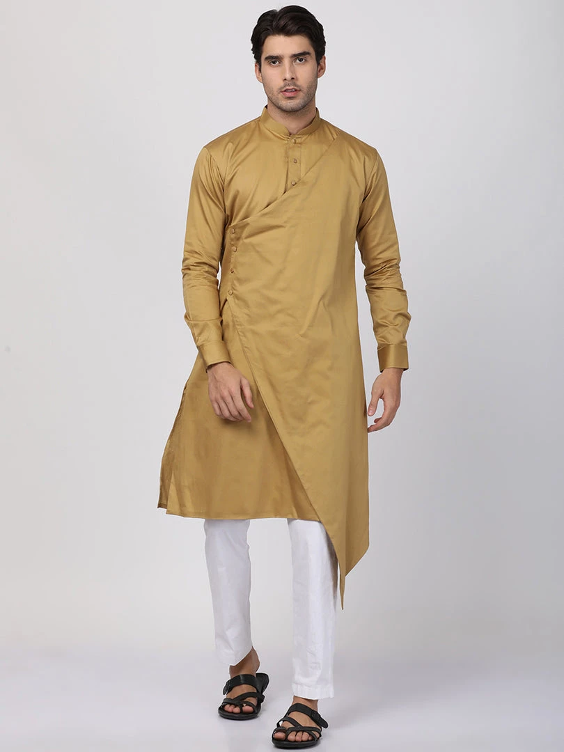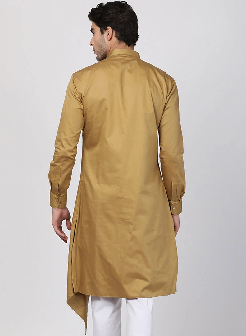 Beige solid layered straight cuff length kurta, has a mandarin collar, button placket, long sleeves, asymmetric hem.