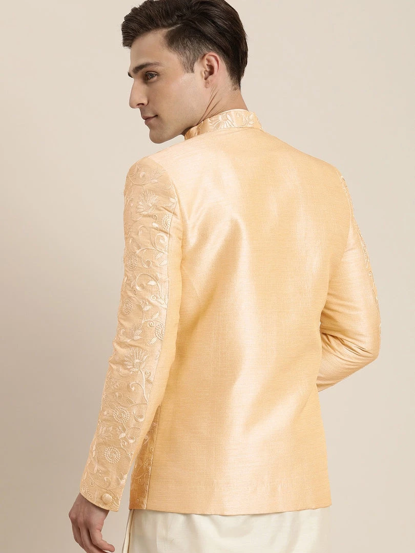 Beige ethnic motif embroidered bandhgala blazer, has a mandarin collar, long sleeves, one chest pocket