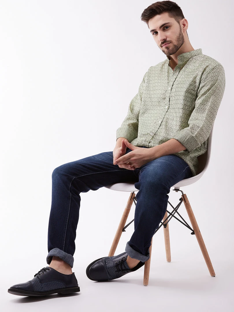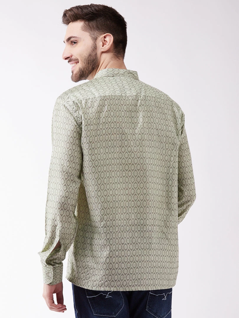 Banarasi Silk Blend Jacquard Fabric Indo Ethnic Shirt, has a Mandarin collar, Long sleeves, straight hem, one patch pocket