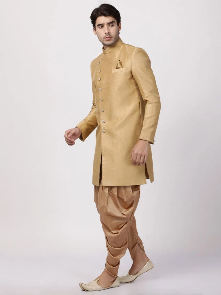 Beige solid sherwani with gold-toned solid dhoti pant