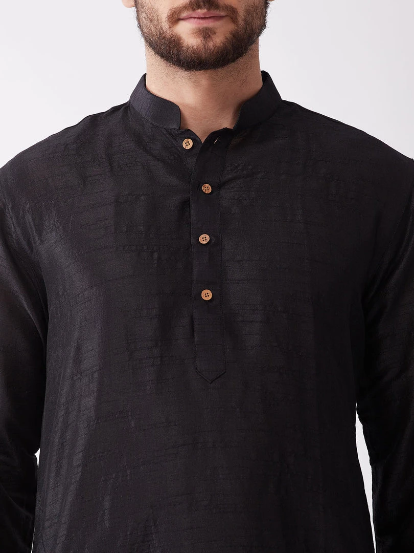 Black solid straight knee-length silk blend kurta, has a mandarin collar, long sleeves, button placket, straight hem