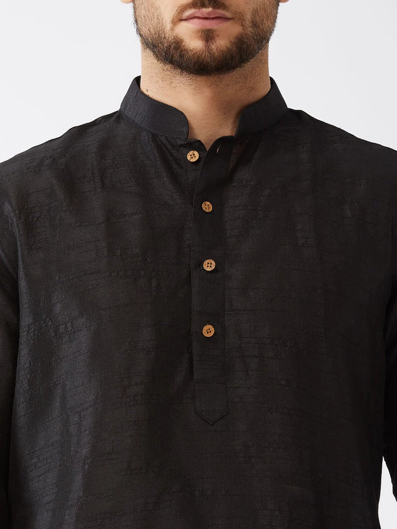 Black solid straight knee-length silk blend kurta, has a mandarin collar, long sleeves, button placket, straight hem