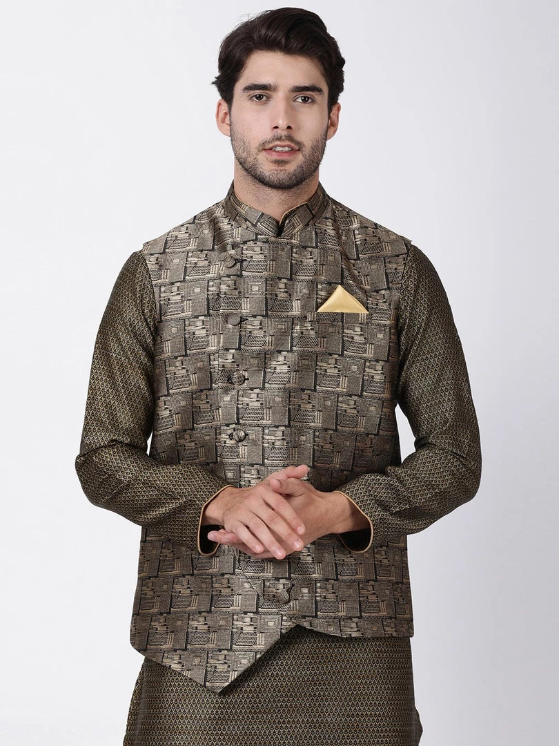 Black and Golden Woven Nehru jacket, Sleeveless, Asymmetrical hem, has a Mandarin Collar, three pockets one with a pocket square.