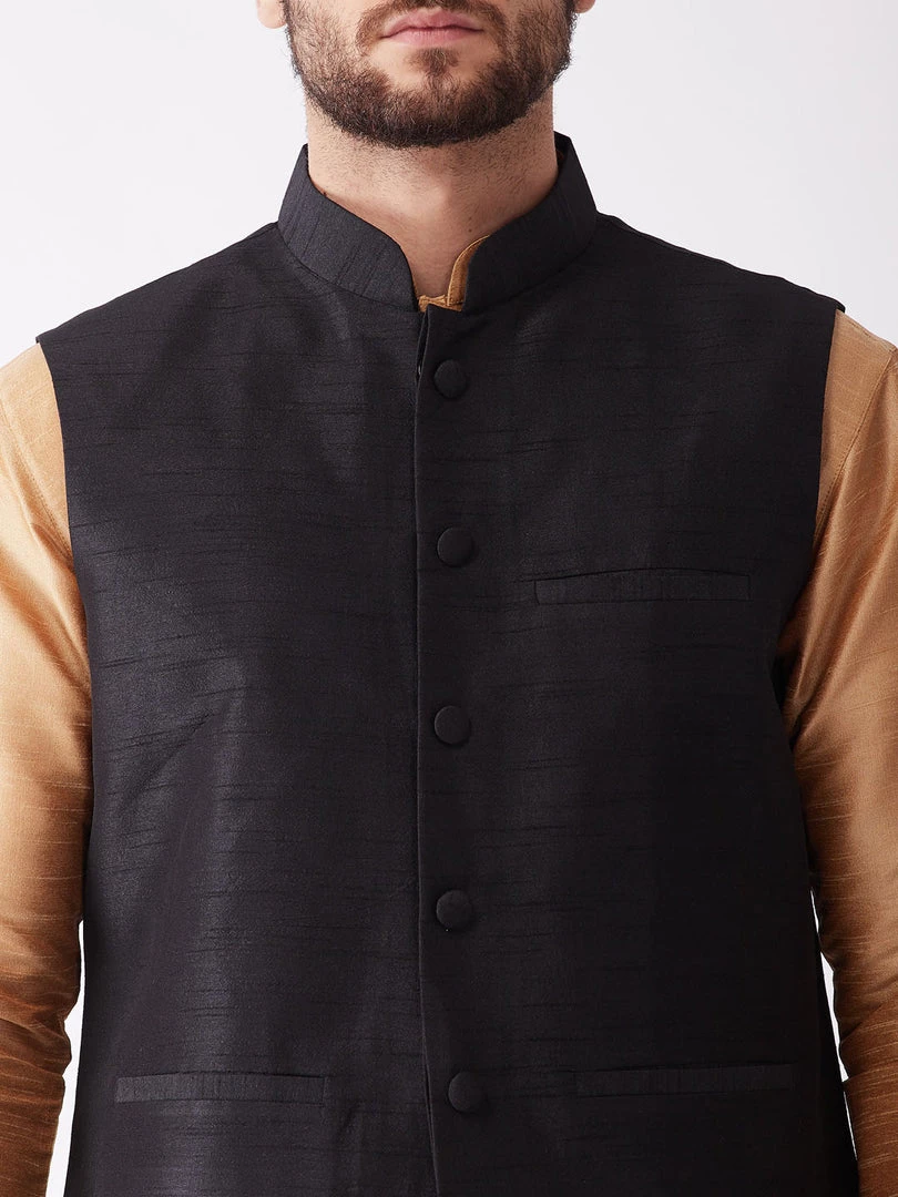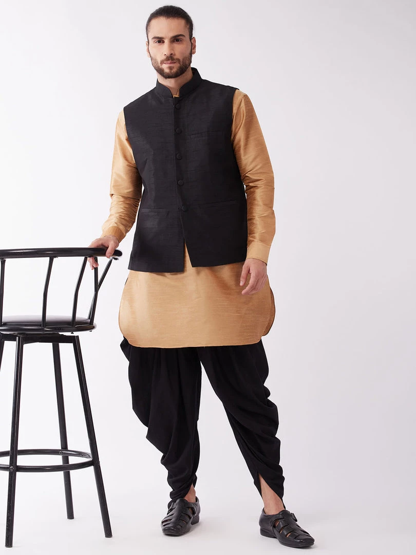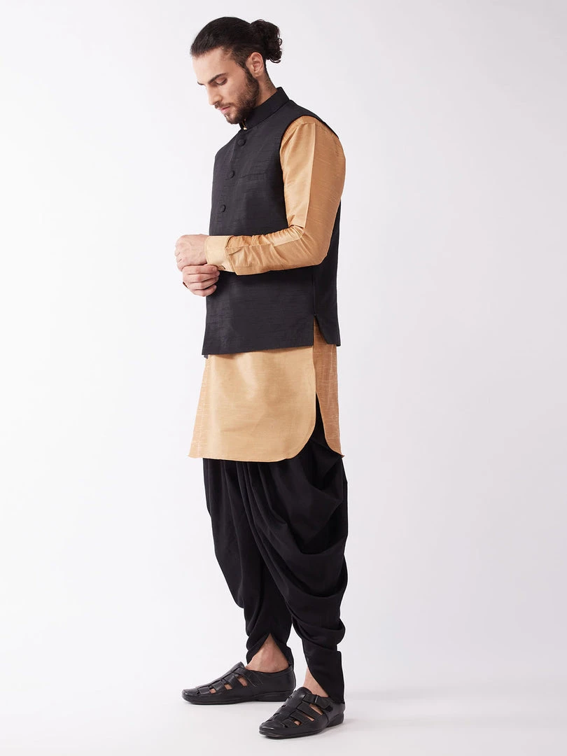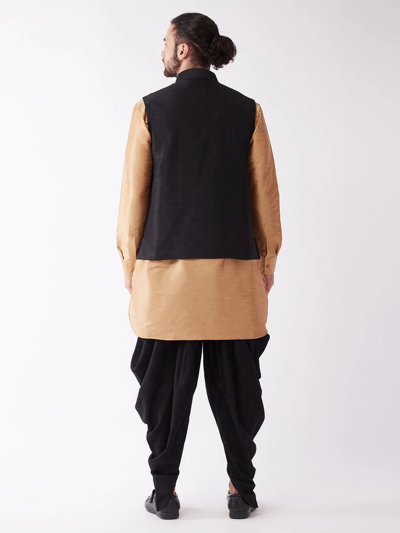 Rose Gold Solid kurta with dhoti pants and Black colored solid Nehru jacket