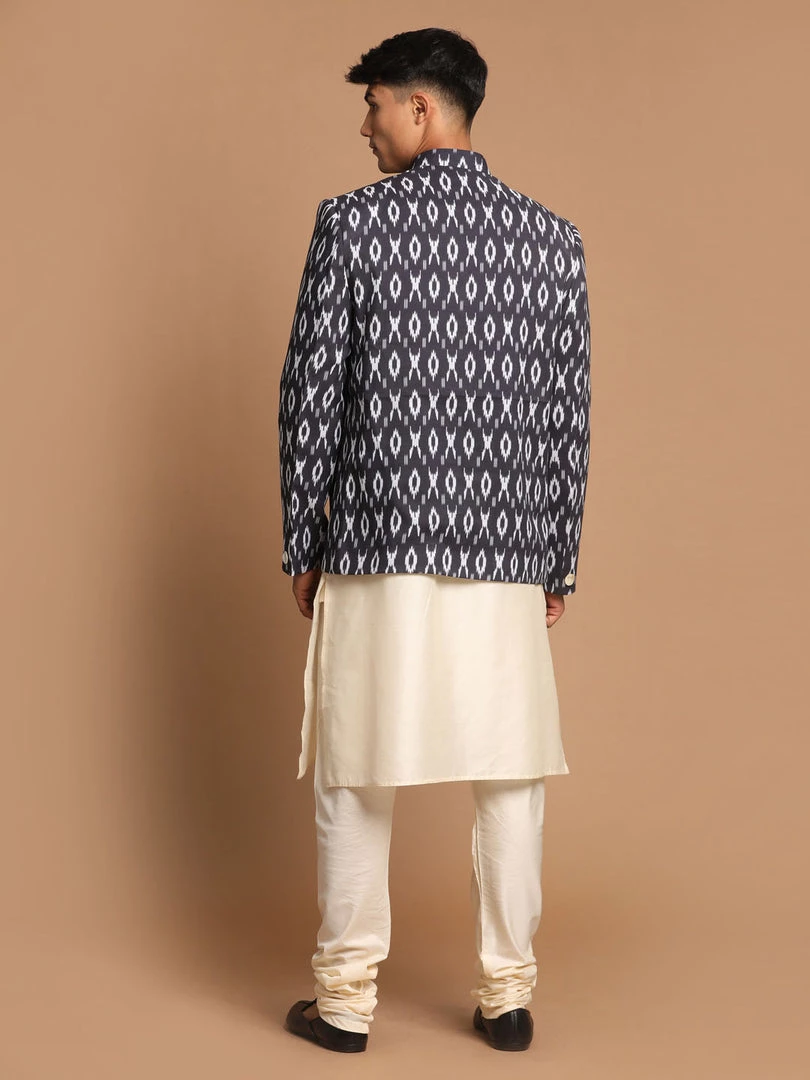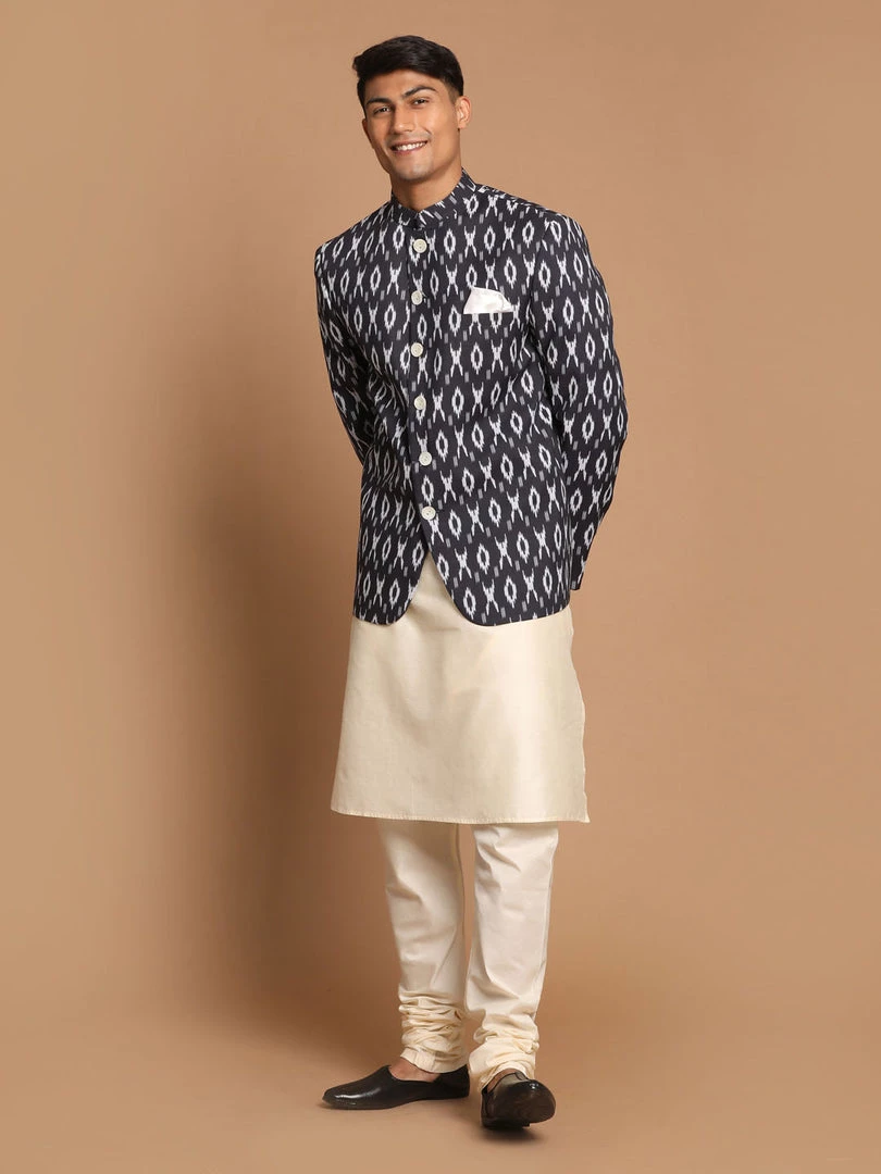 Cream Solid kurta with solid Churidar and Ikkat Print Black Color Nehru jacket