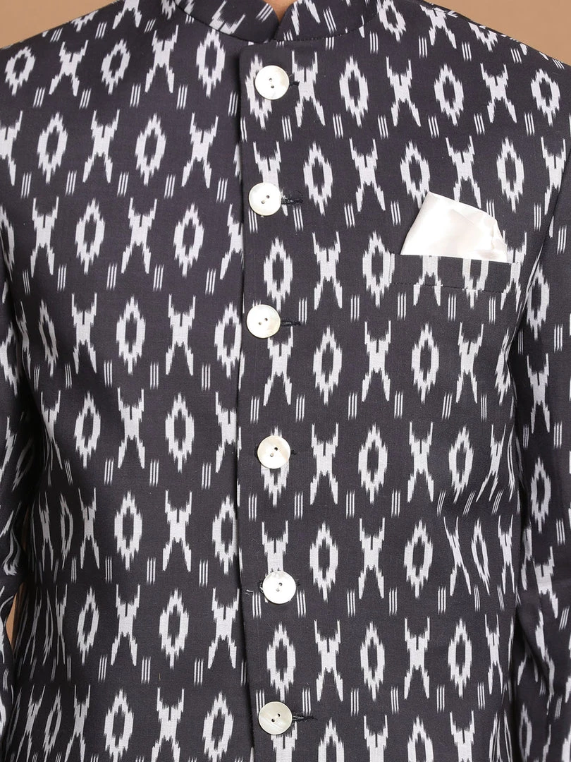 Black Ikkat Print Nehru jacket, has a mandarin collar, a full button placket, long sleeves with pocket