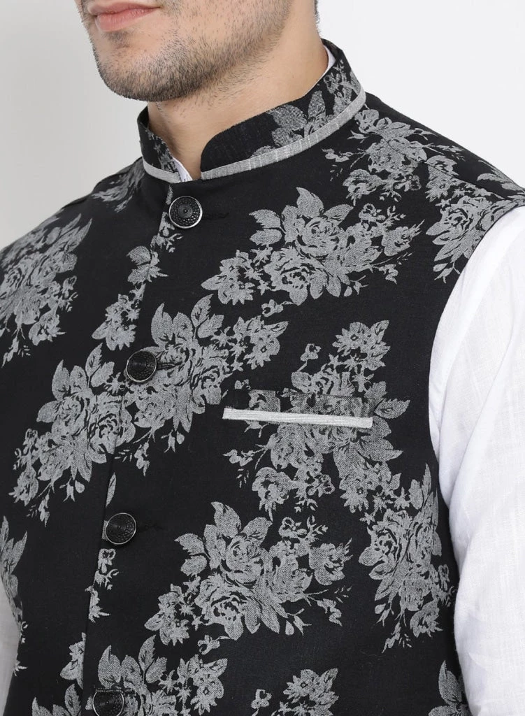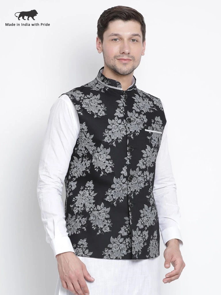 Black printed Nehru jacket, has a mandarin collar, a full button placket, sleeveless, a welt pocket