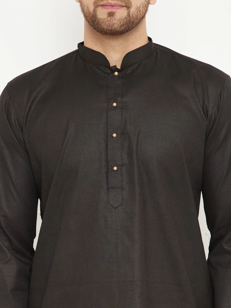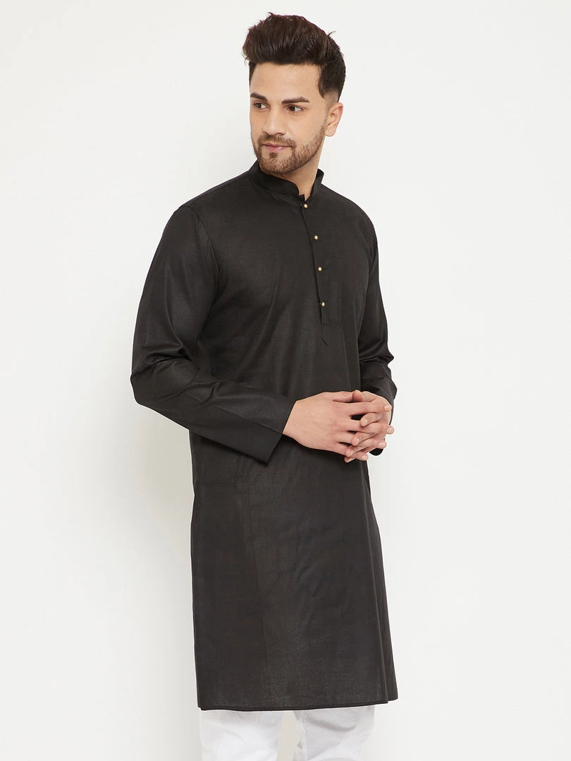 Black solid straight kurta, has a mandarin collar, long sleeves, button placket, straight hem, and side slits.