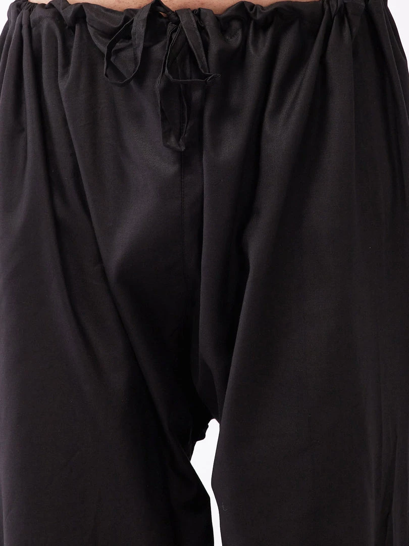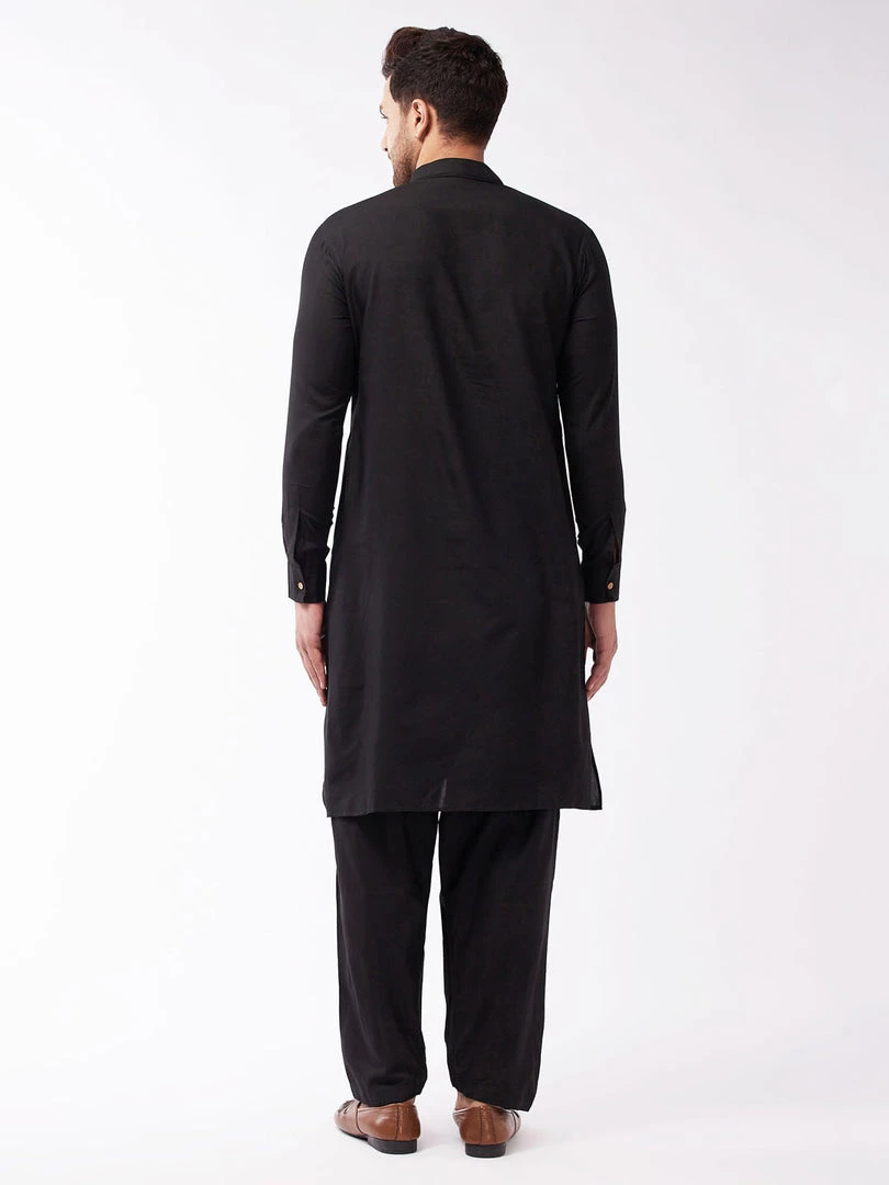 Black solid straight knee length kurta, has a mandarin collar, long sleeves, button placket, straight hem.